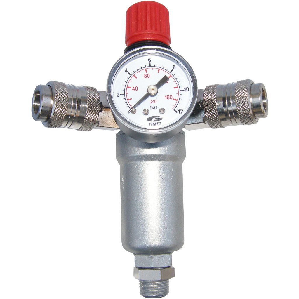 Profesionálny membránový reduktor so značkovým indikátorom tlaku FIMET v baroch a psi a filtrom na predčistenie vzduchu s filtráciou do 25 mikrónov.