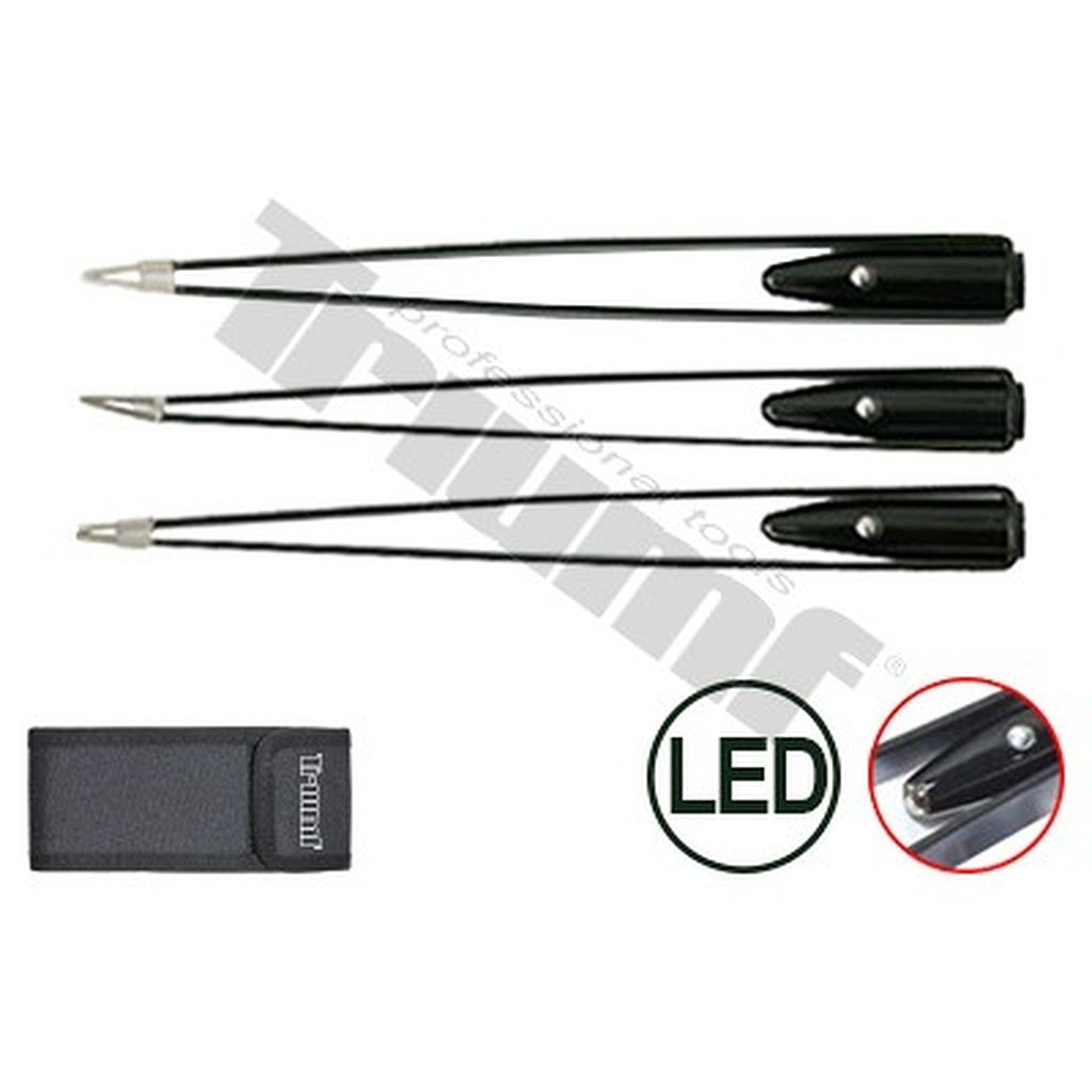 Predĺžené prevedenie, rôzne tvarované zakončenia. Každá pinzeta dodatočne vybavená LED svetlom.Dodávané v púzdre.