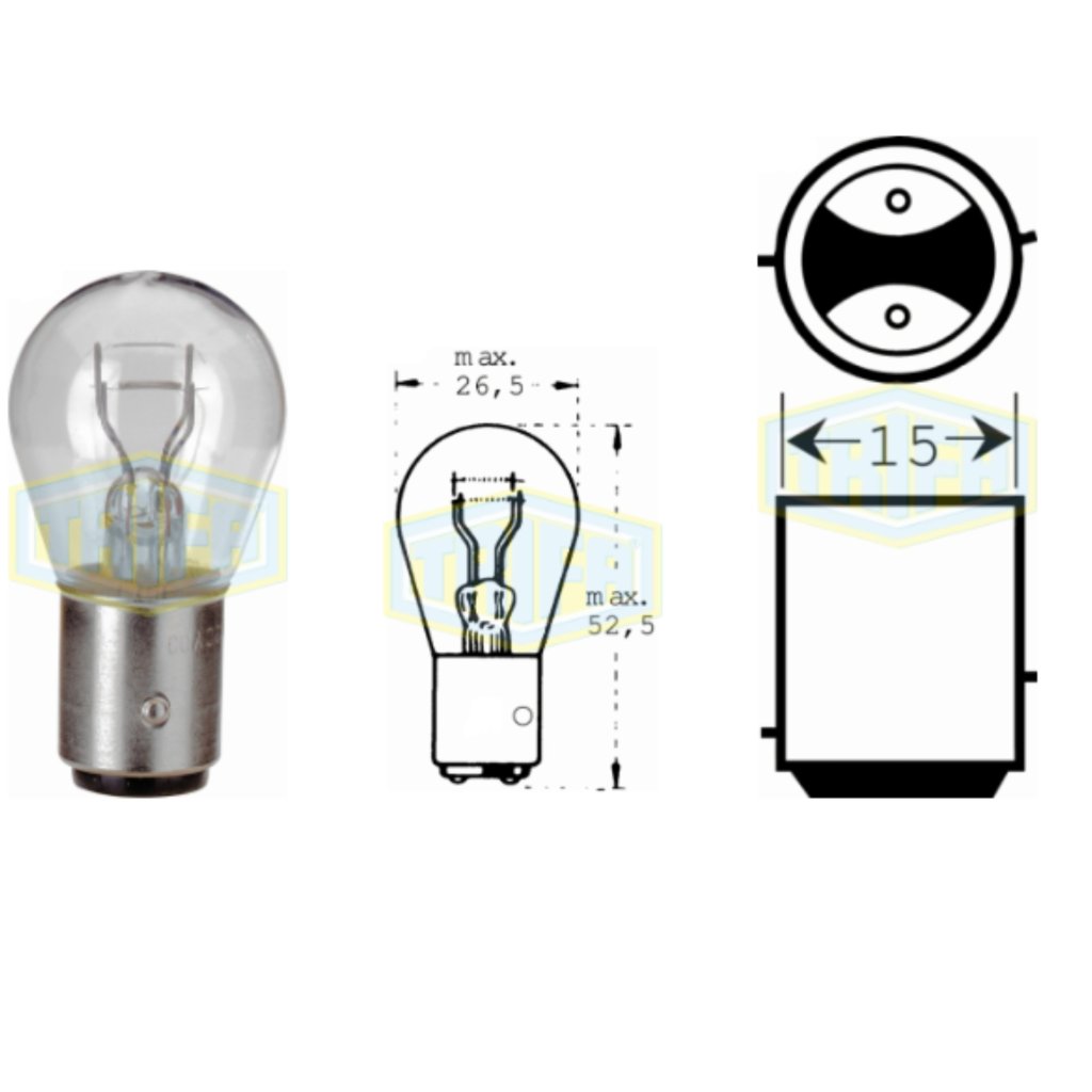 Univerzálna autožiarovka s napätím 12V a výkonom 21/4 W, určená pre brzdové a zadné svetlá. Disponuje dvojvláknovým systémom, ktorý zabezpečuje funkciu oboch svetelných režimov – pozičného a brzdového. Pätica typu BAZ15d umožňuje jednoduchú výmenu a spoľahlivé pripojenie v svietidle vozidla.