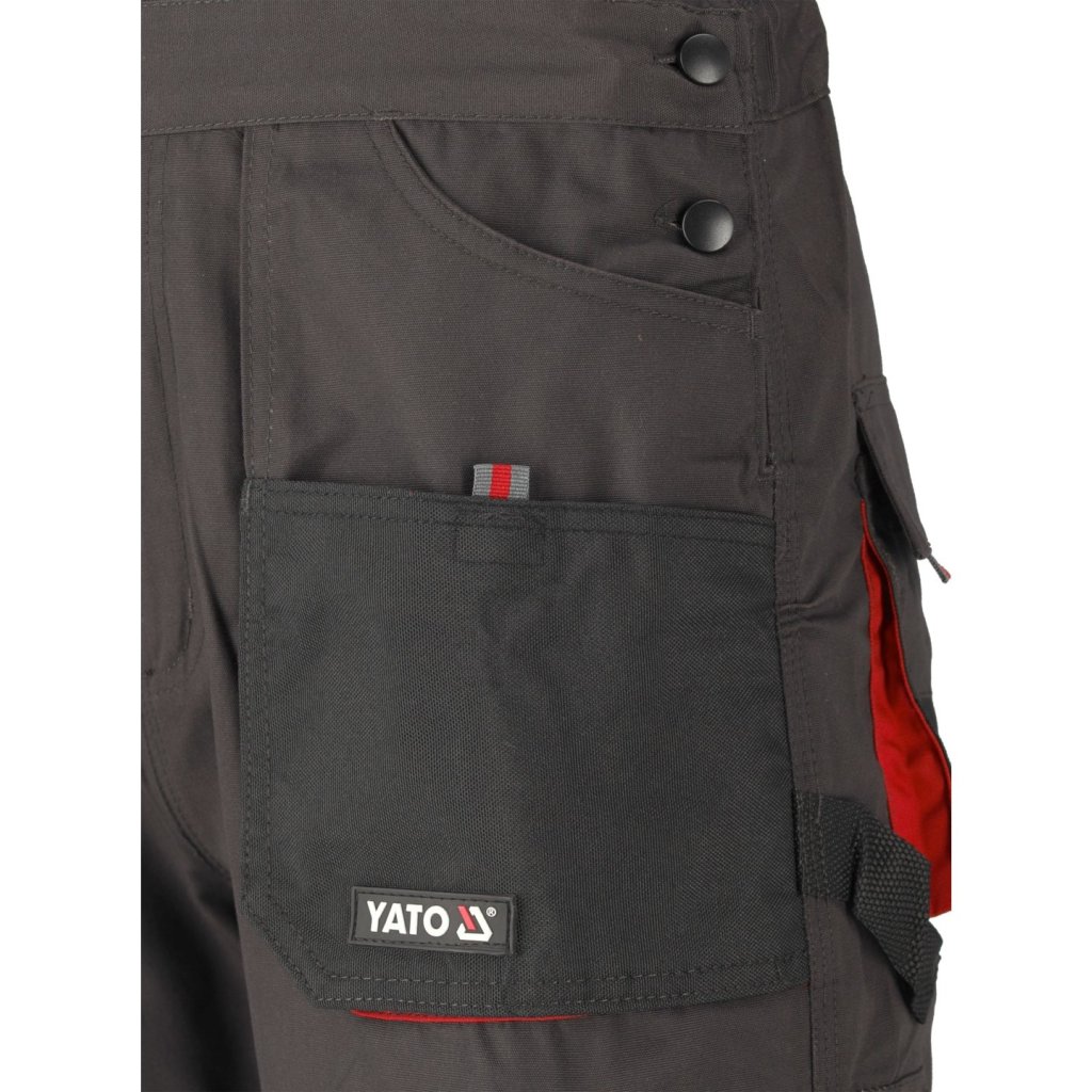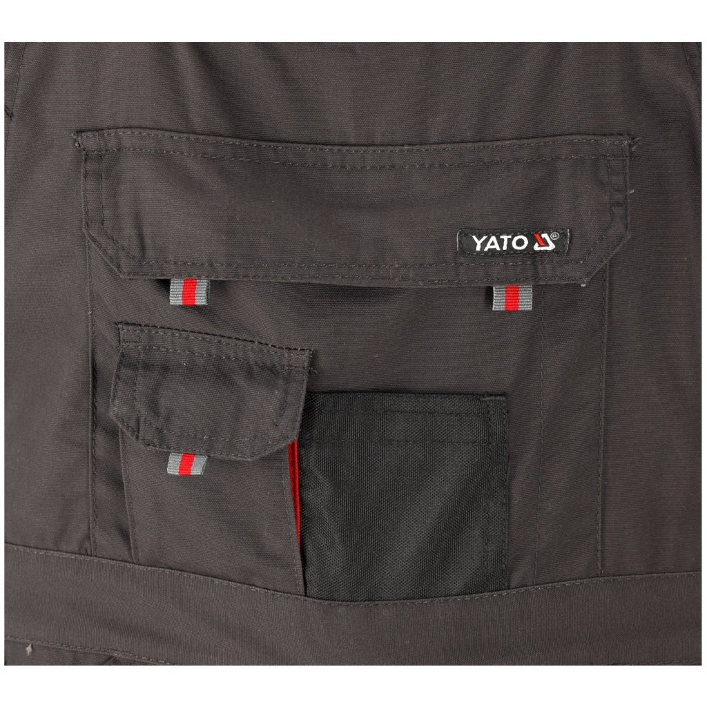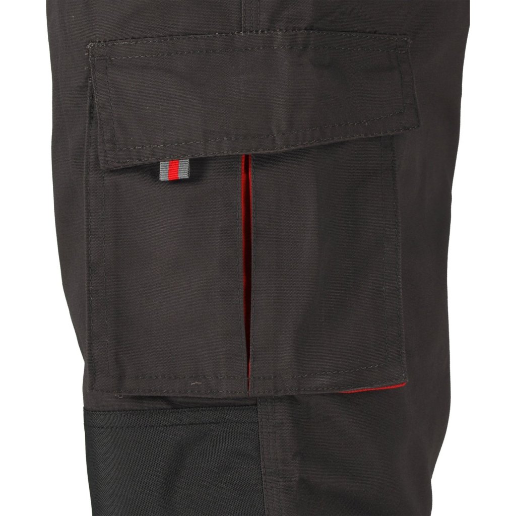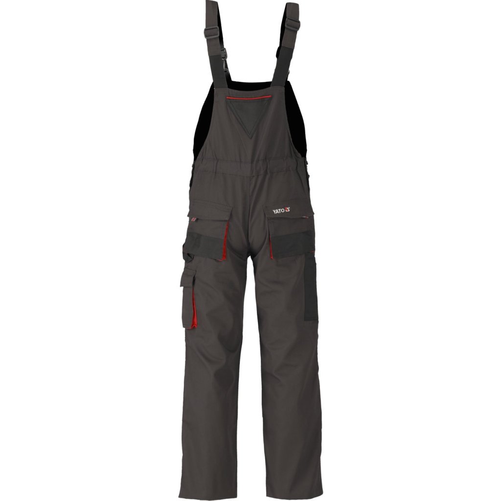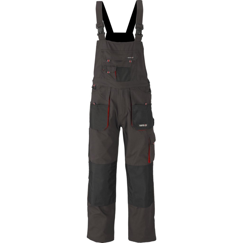 Pracovné nohavice s postrojom s jedenástimi vreckami, z ktorých sedem má zapínanie na suchý zips a špeciálne vrecká na kolenné chrániče.