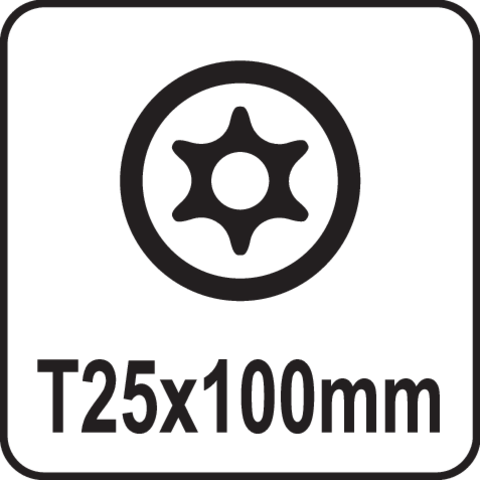 Skrutkovač TORX T25x100 mm od spoločnosti YATO s valcovou stopkou z ocele S2, kalenou na približne 58 HRC. Hrot torx securiti má vnútorný otvor na manipuláciu s bezpečnými nástrčkami.