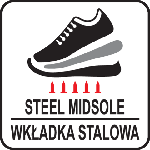 - oceľová stielka proti prepichnutiu, ktorá chráni chodidlo pred prepichnutím spôsobeným ostrými prvkami s tlakom až 1 100 N