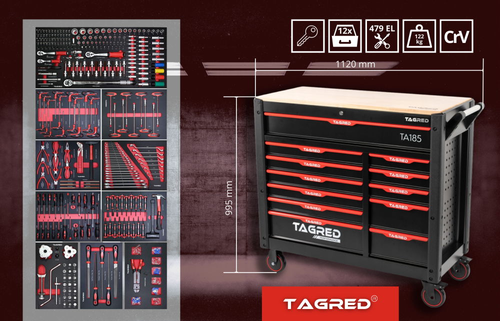 Dielenský vozík Tagred je vybavený doplnkovou sadou špičkového náradia, ktoré uspokojí potreby aj toho najnáročnejšieho užívateľa. Bohatá výbava skrine TAGRED vám umožní prispôsobiť vašu súpravu náradia potrebám tých najnáročnejších dielenských výziev.