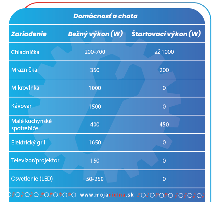 V tabuľke nájdete produkty a k ním výkon pri štartovaní a pri bežnom používaní: