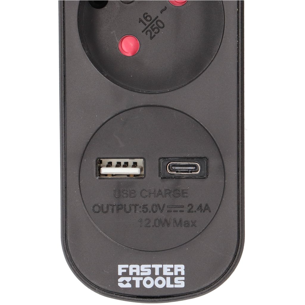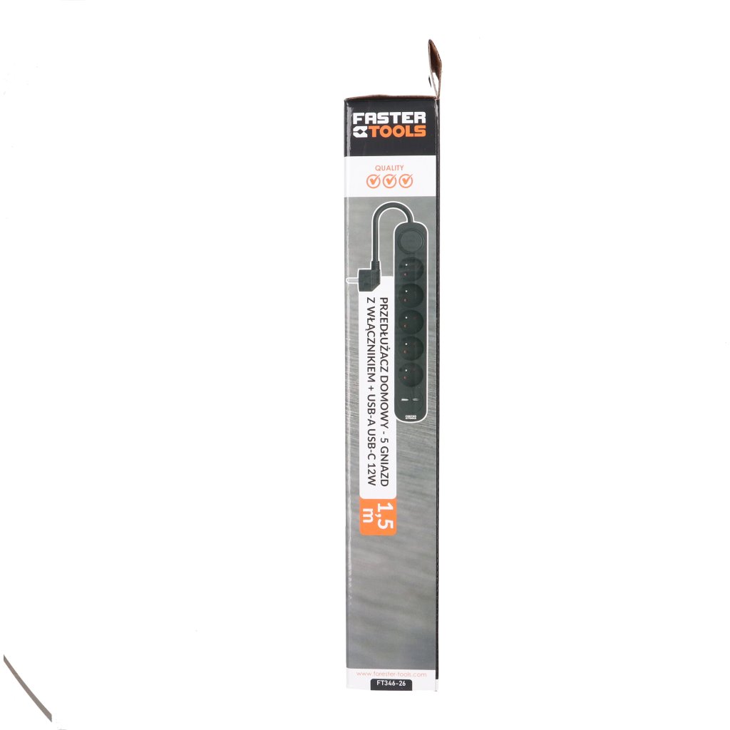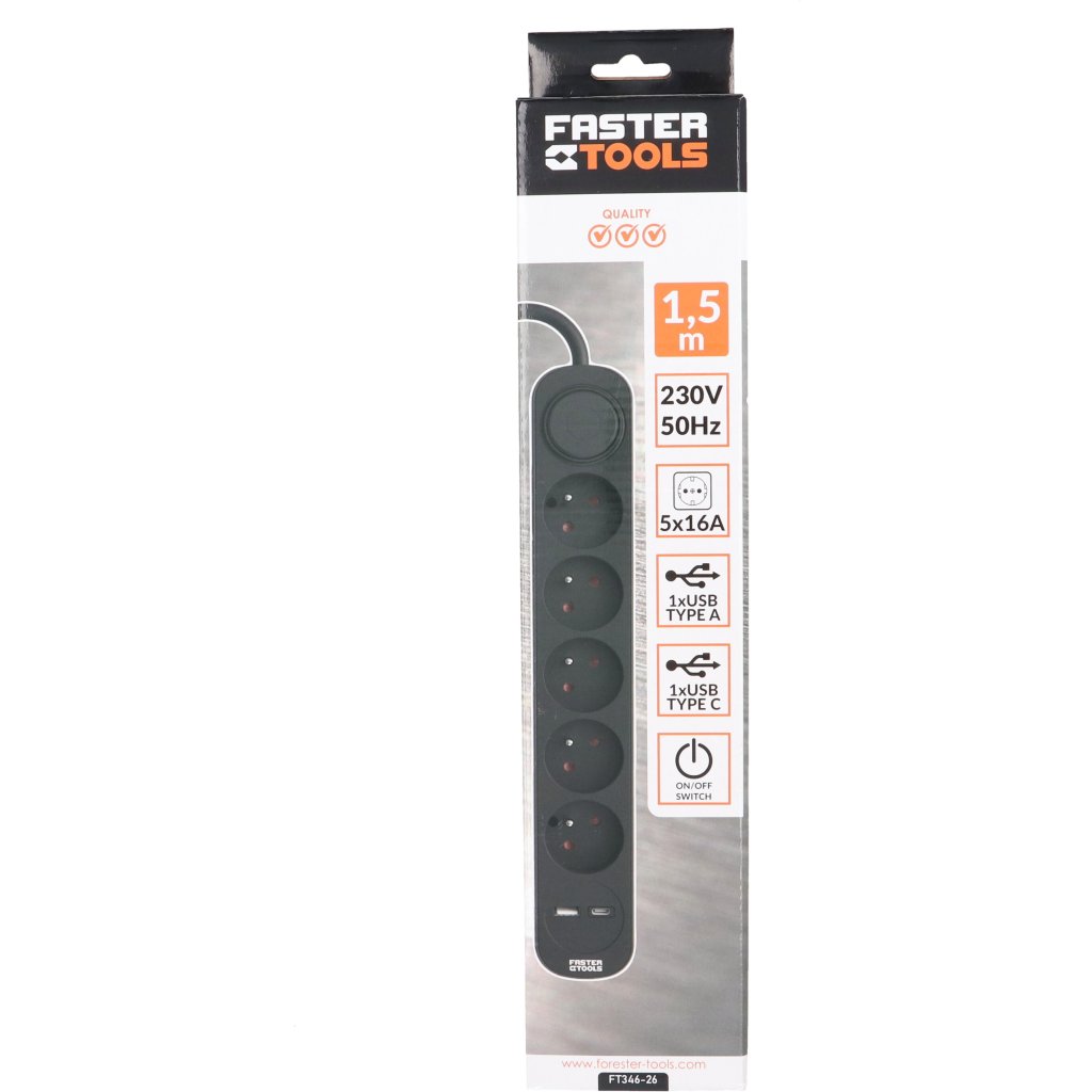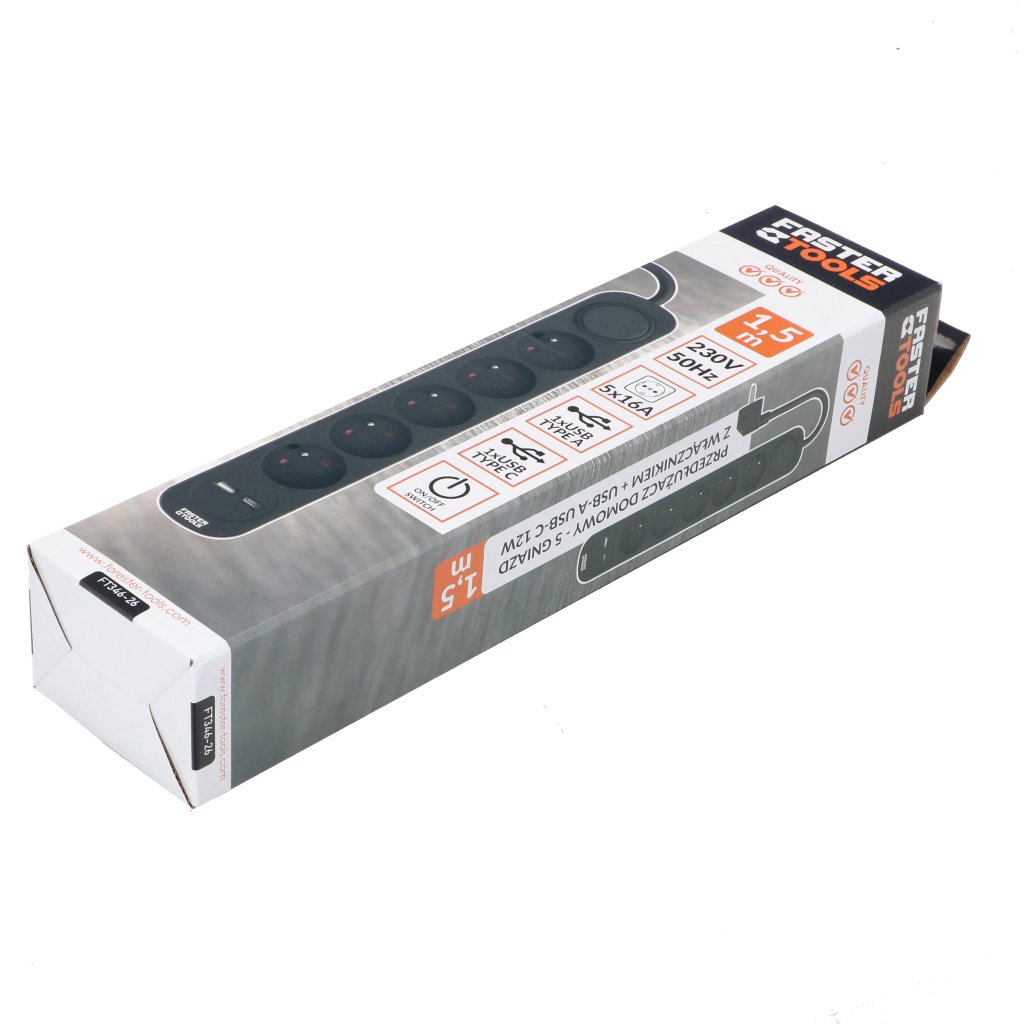 FASTER TOOLS čierny predlžovací kábel s 5 zásuvkami 1,5 m s prepínačom USB-A/USB-C