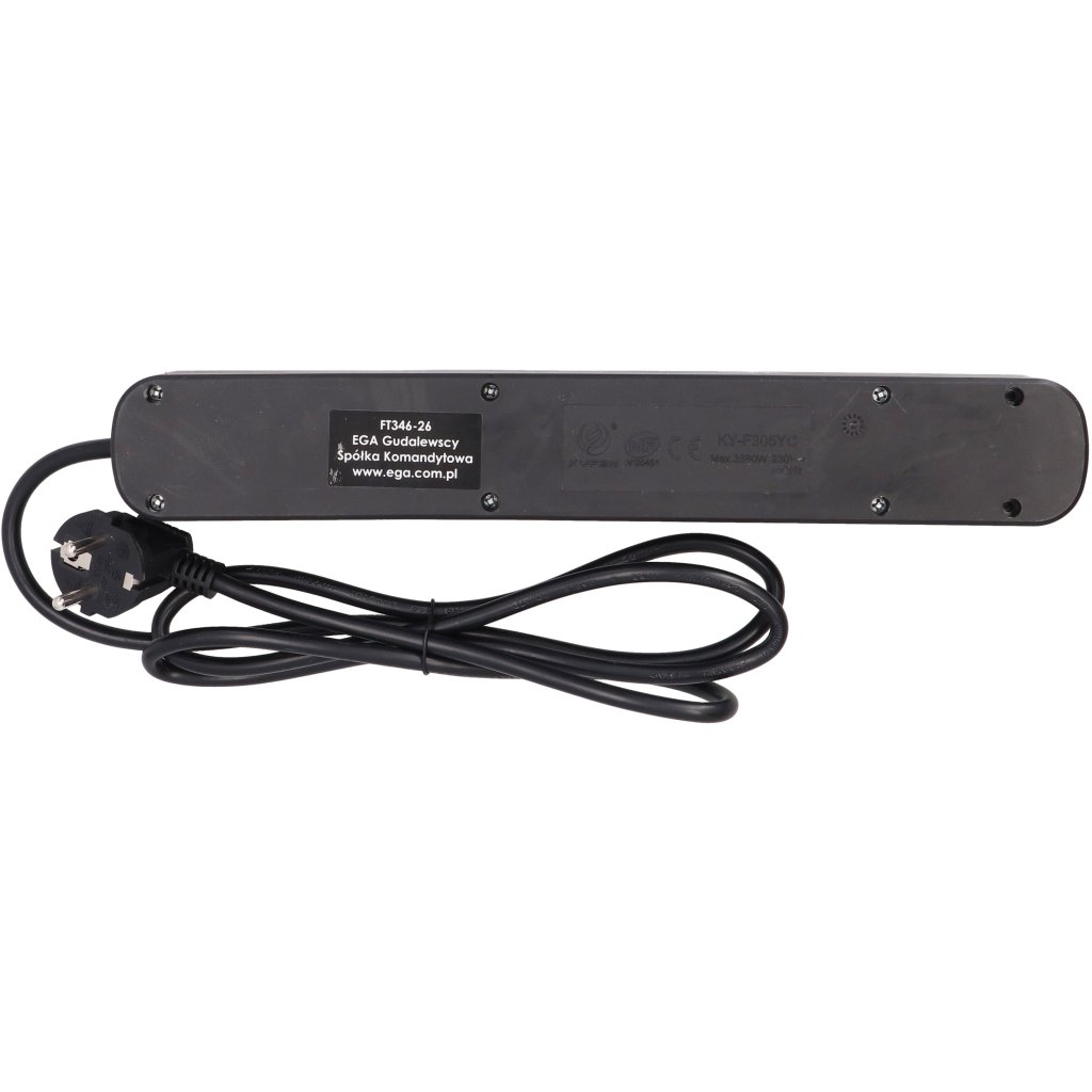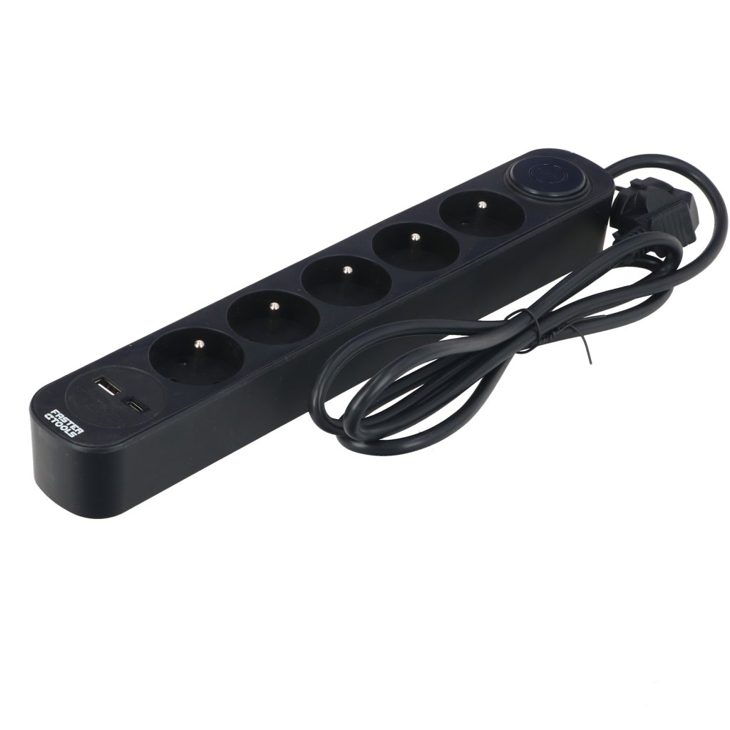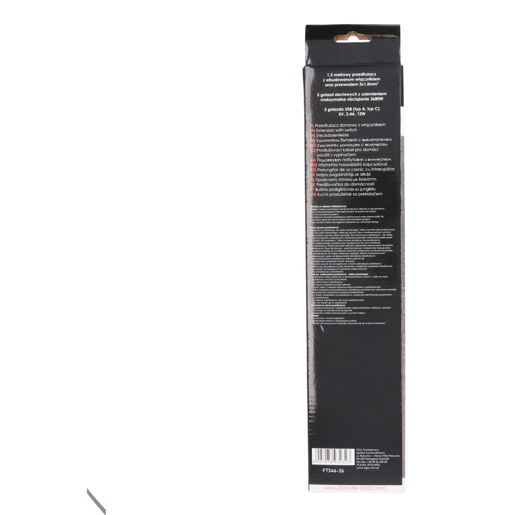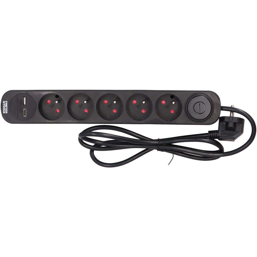 FASTER TOOLS čierny predlžovací kábel s 5 zásuvkami 1,5 m s prepínačom USB-A/USB-C