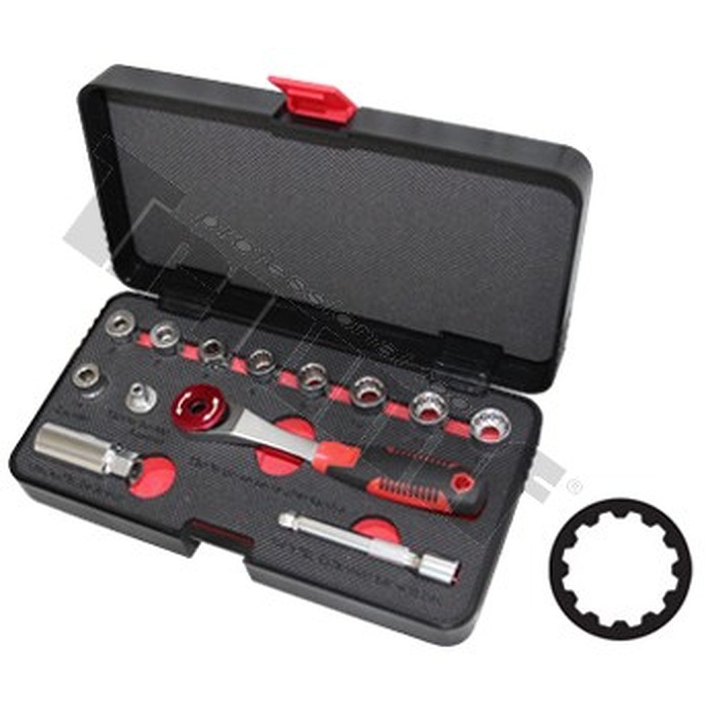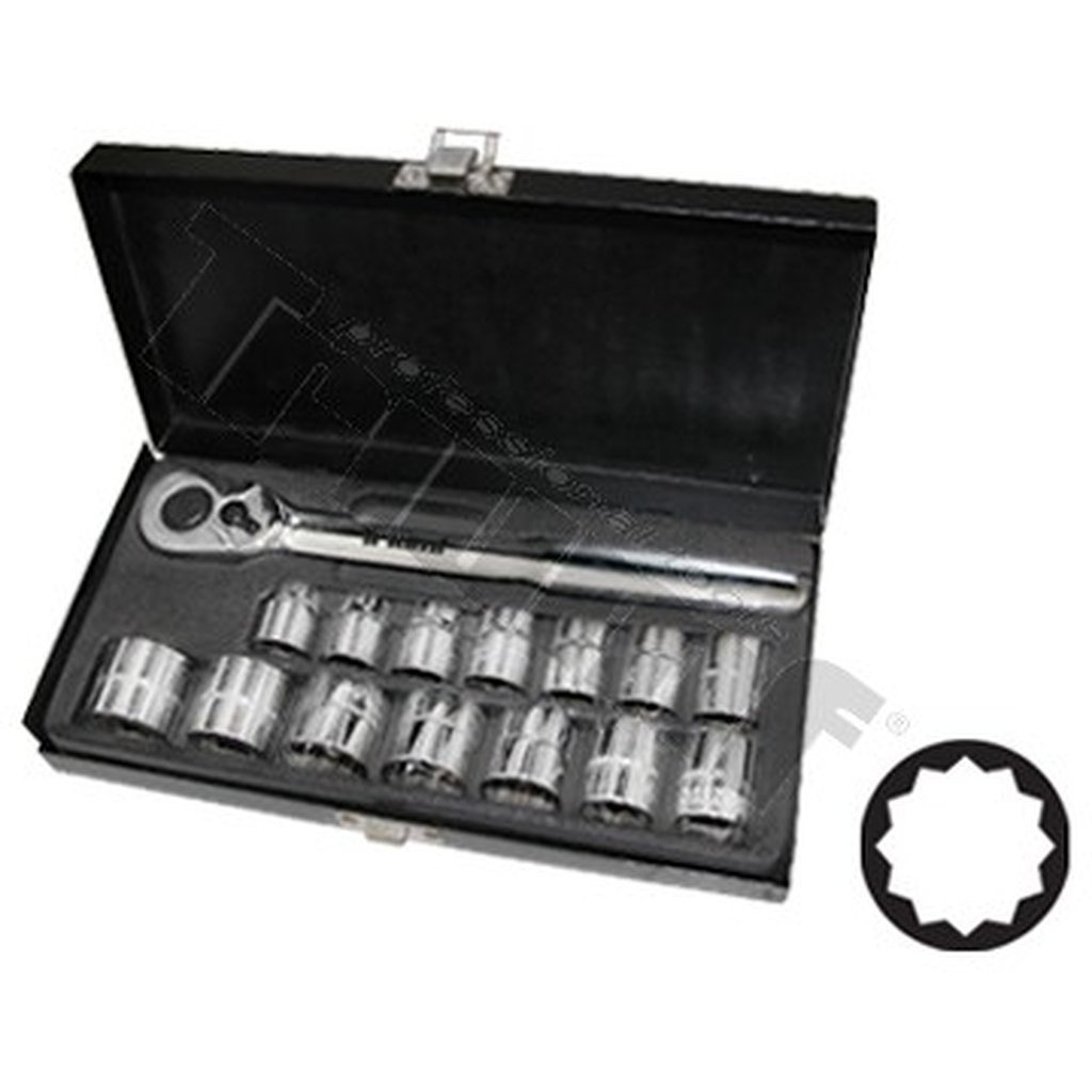12 hranné nízke hlavice vo veľkostiach: 5,6,7,8,9,10,11,12mm. Sada obsahuje 2 predĺženia a držiak bitov.