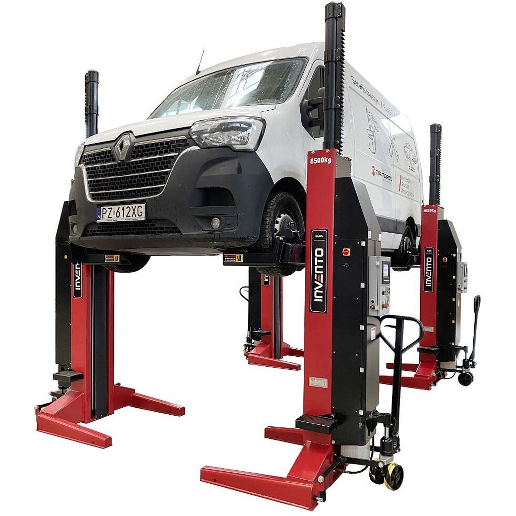 INVENTO EL 85 is a set of mobile adjustable columns with a lifting capacity of 8.5 tons per column, which in a set of 4 columns gives a total of as much as 34 tons! The columns are battery-powered, and wireless communication between the columns ensures high comfort and convenience of work!Additionally, they have an adjustable fork spacing and can be expanded with additional columns at any time. INVENTO EL 85 mobile column lifts are "mobile", which means they can be moved very easily on synthetic wheels using a hydraulic pallet mechanism with overload protection. Specification: Designed for trucks, trailers and machines, Communication between the columns is wireless (cables included, allowing for cable connection), A set of mobile columns made of high-quality materials, with thick steel sections, guaranteeing strength and stability, Possibility of expansion with a larger number of columns (up to 96 in total), Possibility to set different heights between pairs of columns, e.g. for lifting a tractor with a semi-trailer, Lifting by hydraulic pistons equipped with a safety valve located inside the cylinder to prevent accidental damage and overload, Electro-hydraulic control system ensuring alignment and synchronization of the trolleys, controlled by a control panel with a color display on each column (control possible from any column in the set), The system is equipped with anti-overload valves, Mechanical safety interlocks with electromagnetically controlled automatic function, The control column has a large touch screen for setting the lifting parameters of the entire set, including the lifting height and the number of columns involved in a given operation. The screen visualizes the current situation and displays advice and messages about problems, Each column is equipped with a set of 2 of its own high-capacity batteries, charged with 230V current, giving the entire system high autonomy (no cable connections between the columns). Features of the lift: The columns have microprocessor control, which ensures full synchronization of the set and safety, The lifts have a number of electrical protections, including: informing about incorrect connection of the columns and the operation of the lift, Mechanical locking of the set height, Columns with a lifting capacity of 8,500 kg per column, Adjustable fork spacing replacing adapters, Possibility to set different heights between pairs of columns.| Kategória: | Výťahy pre nákladné vozidlá |