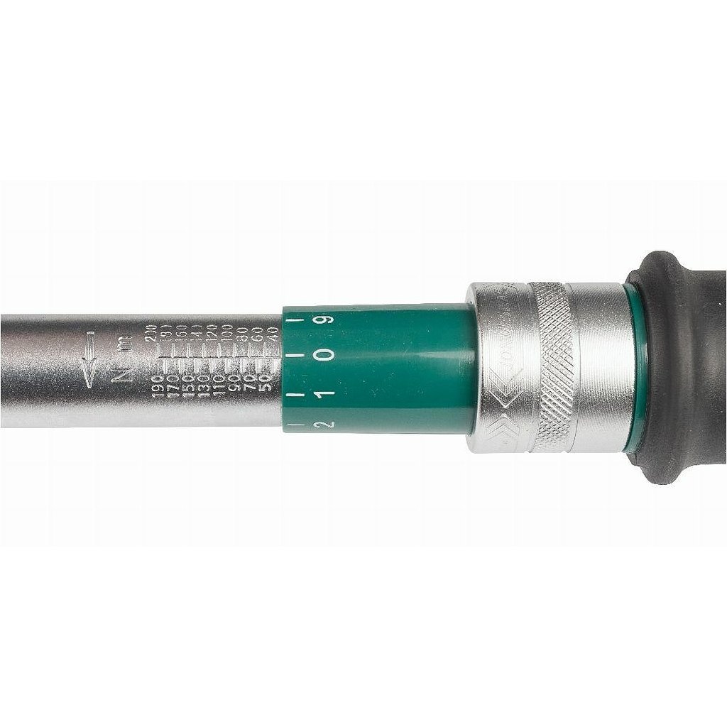 - Otáčajte rukoväťou v smere hodinových ručičiek, kým vertikálna čiara na primárnej stupnici nebude zarovnaná s čiarou označenou "0" na pomocnej stupnici. Kľúč je nastavený na najnižšiu hodnotu viditeľnú na základnej stupnici, napr. 100 Nm
