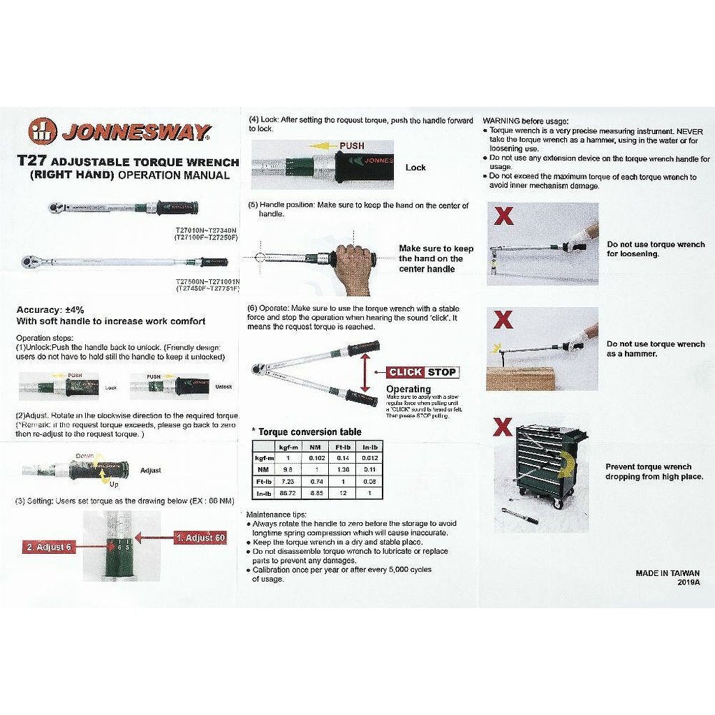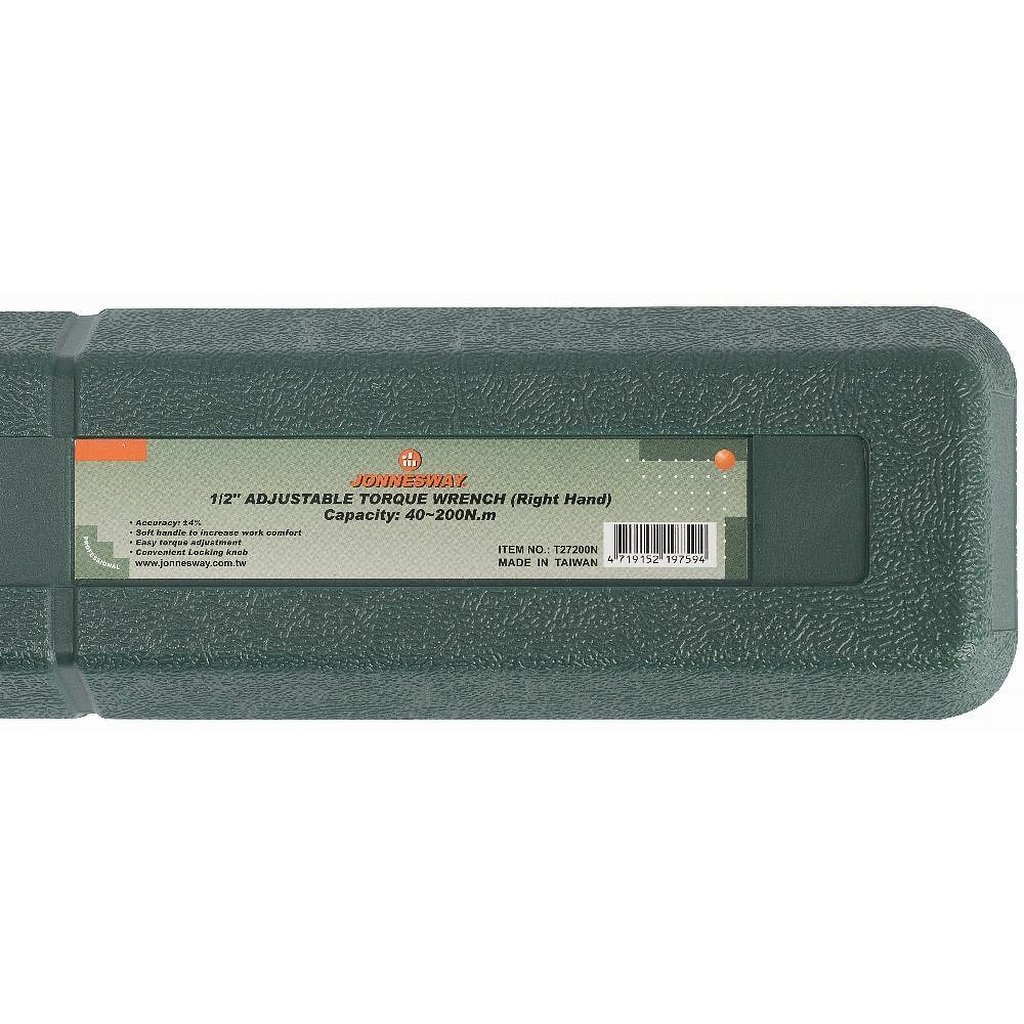 Momentový kľúč Jonnesway 1/2 palcový, model T27200N, s rozsahom krútiaceho momentu 40-200 Nm , je určený na uťahovanie skrutiek s presne nastaviteľným krútiacim momentom. Ponúkaný model je určený len na uťahovanie skrutiek s pravým závitom.