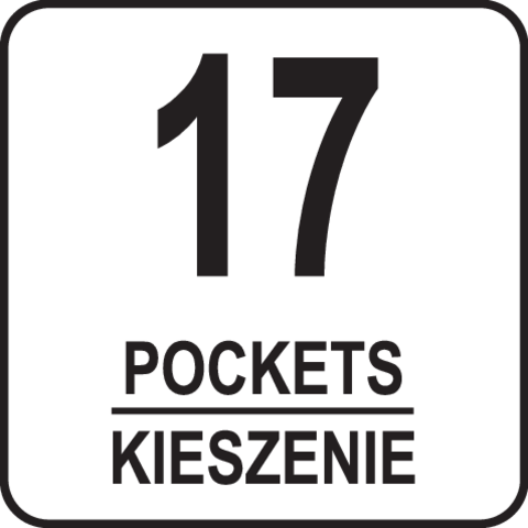 - na ľavej nohavici veľké vrecko na zips, štyri úzke vrecká a štyri pútka na náradie
