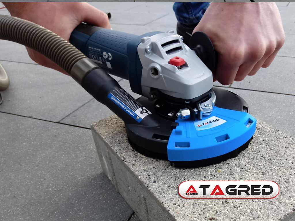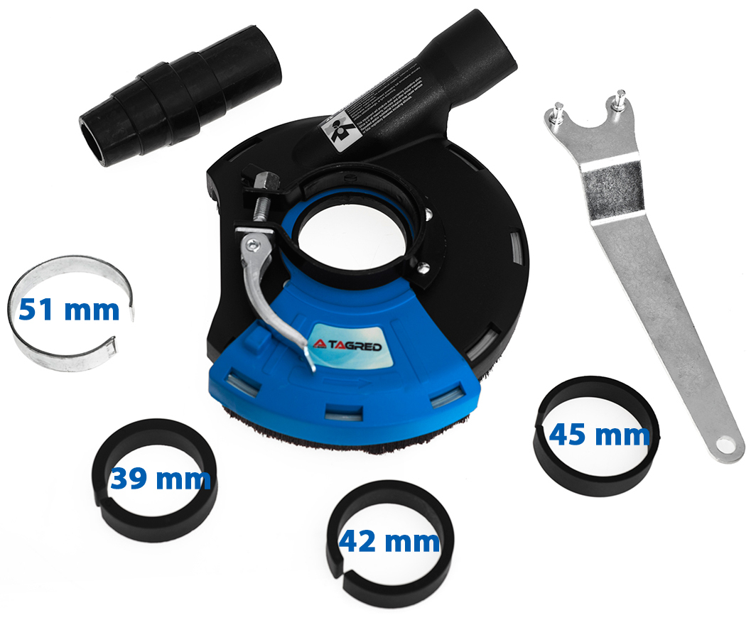 Extrakčný kryt s kefovým krúžkom poskytuje dodatočnú ochranu pri brúsení. Adaptér/štít umožňuje efektívne odsávanie škodlivého prachu pri brúsení hladkých povrchov. Zariadenie je pripevnené k prírube vretena na mieste štandardného kovového krytu, čo zaisťuje tesné a pevné spojenie krytu s brúskou, všetko je počas prevádzky stabilné a odsáva sa takmer 100% prachu.