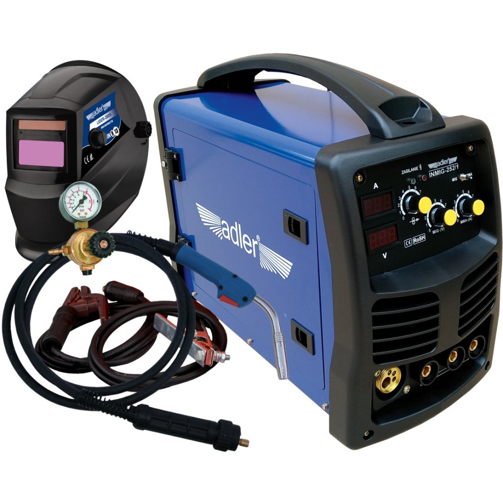 Zariadenie Adler INMIG-252 má plynulú reguláciu napätia a prúdu ako aj rýchlosti podávania drôtu. Je vybavený dvoma LCD displejmi umožňujúcimi plynulé ovládanie prevádzkových parametrov. Použitie EURO zásuvky umožňuje pripojiť akýkoľvek MIG kábel s EURO konektorom bez nutnosti demontáže zariadenia. Na zadnom paneli je zásuvka pre redukciu plynu. Hrubé (25 mm2), predĺžené zváracie káble uľahčujú zváranie. Dĺžka káblov ku držiakom elektród - 2 m. Dĺžka kábla s MIG horákom - 3,5 m.