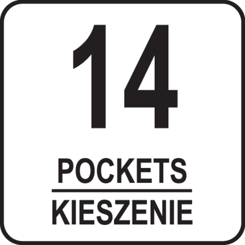 | Počet vreciek: | 14 vonkajších (2 so zapínaním na suchý zips, 2 vzadu, z toho 1 na jeden patent, vrecká na kolenách na chrániče kolien) |