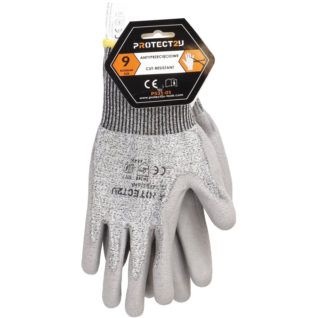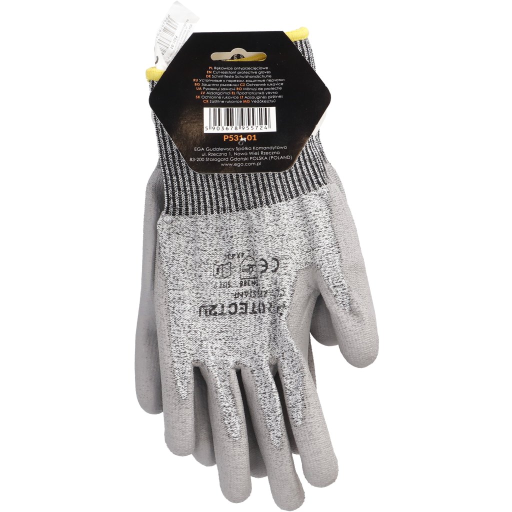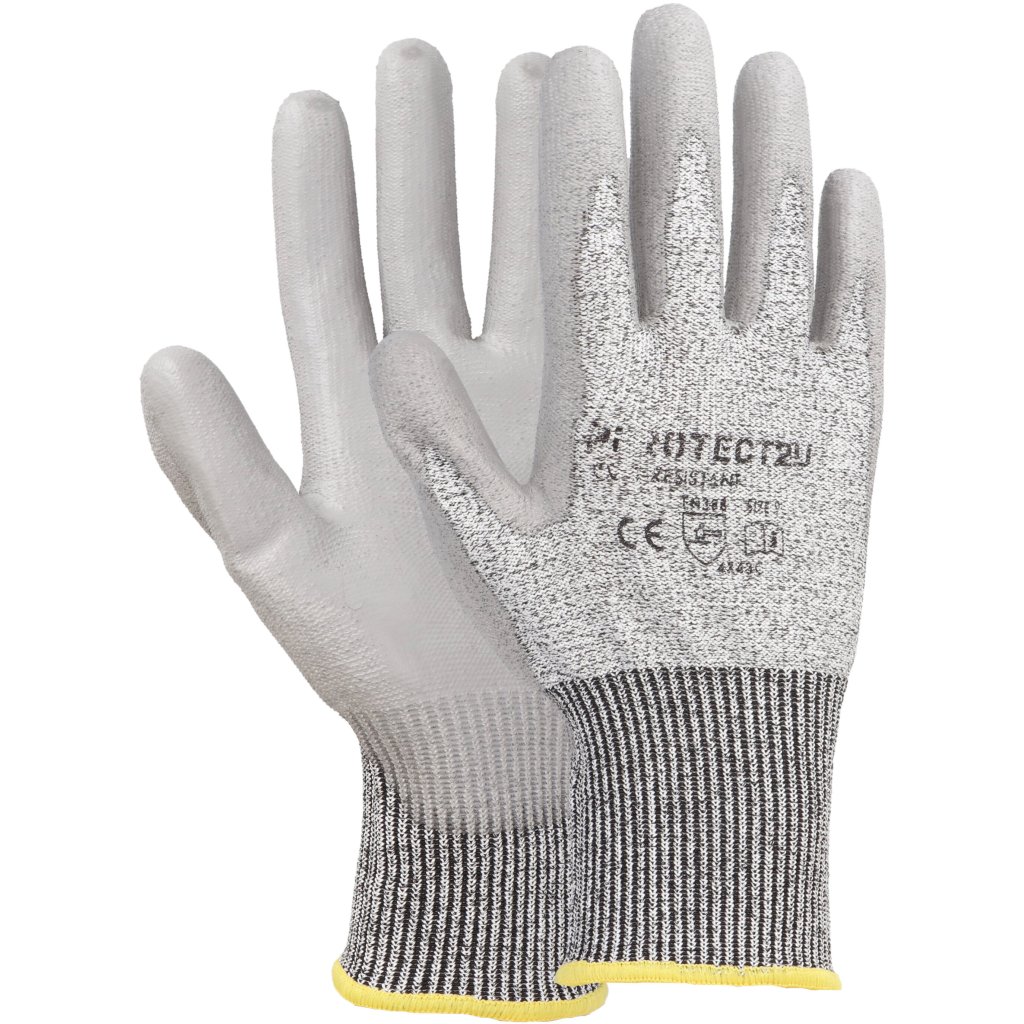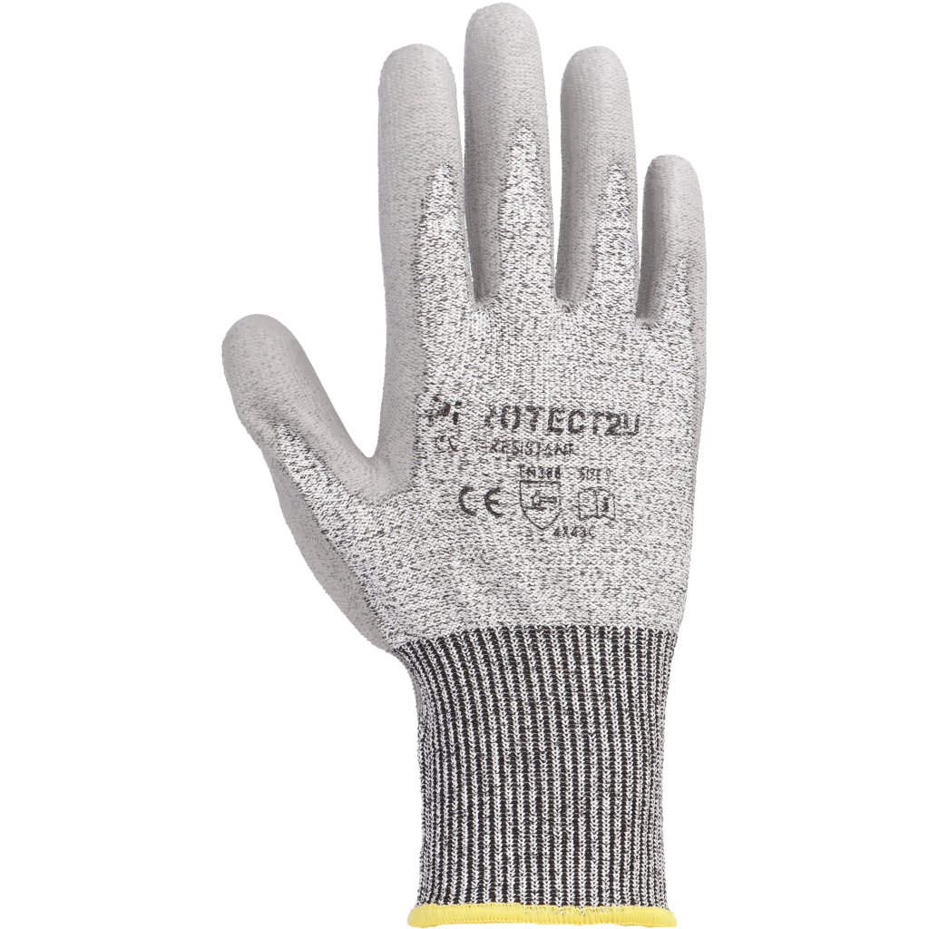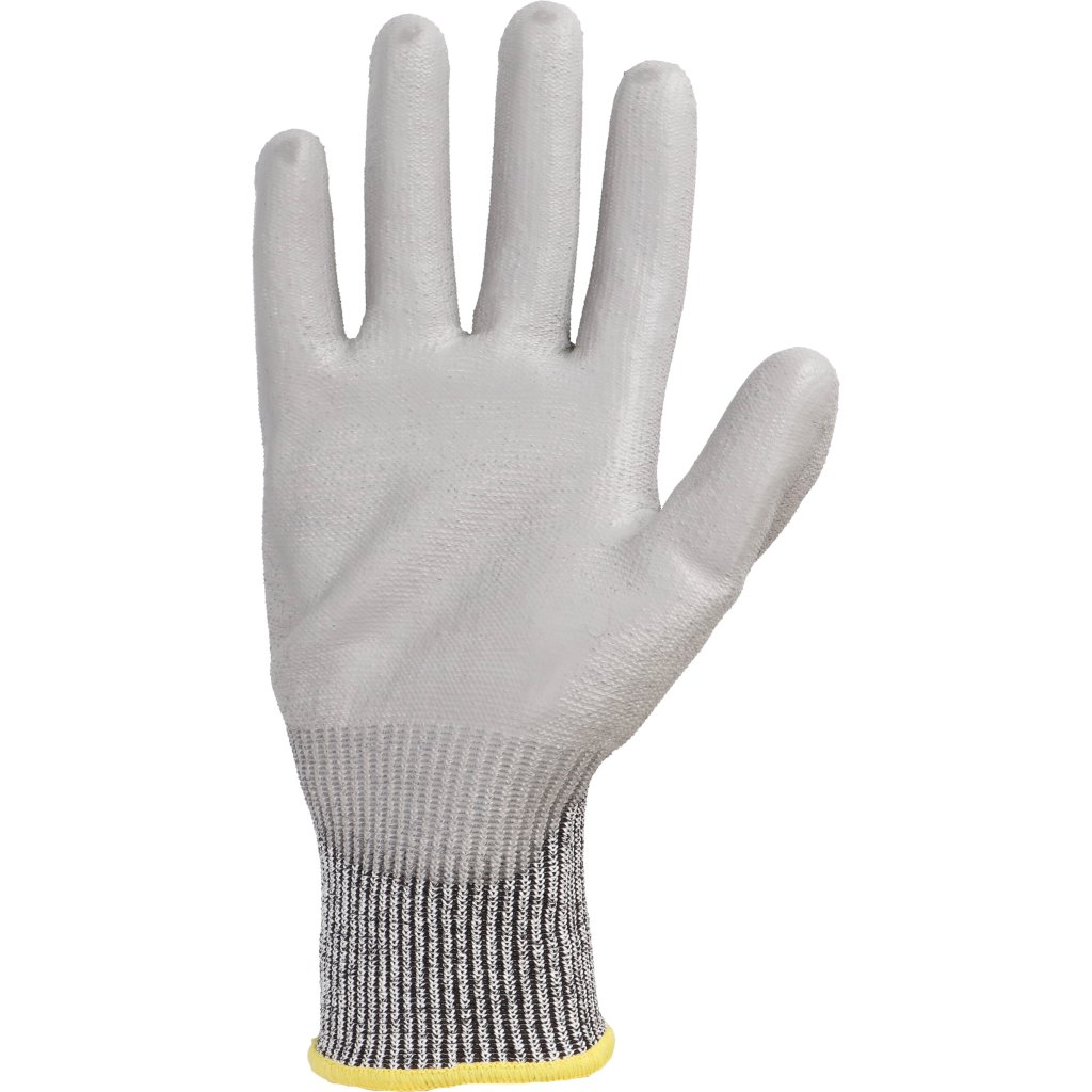 Vonkajšia časť dlane a prstov je potiahnutá tenkou vrstvou polyuretánu (PU), ktorá zabezpečuje pevný a stabilný úchop aj na hladkých alebo mierne vlhkých povrchoch. Povrchová úprava je odolná voči oderu a neobmedzuje presnosť pohybov, čo umožňuje vykonávať aj jemné manuálne práce.