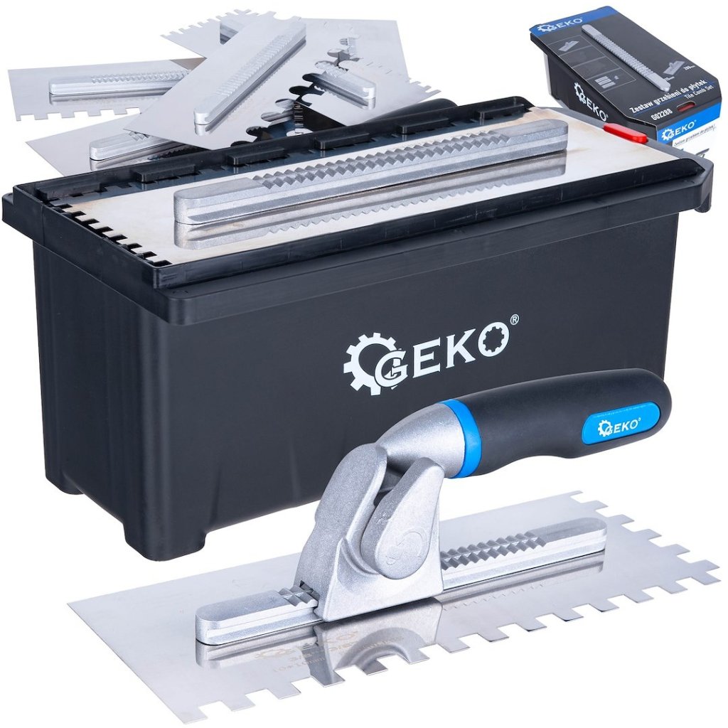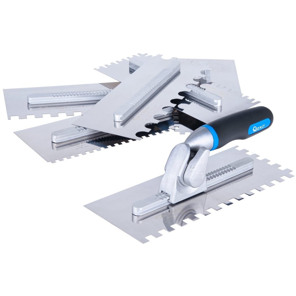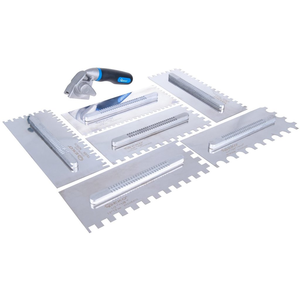 Kompletná sada na nanášanie lepidla na dlaždice – 6 vymeniteľných hrebeňov s rôznymi typmi zubov, rýchloupínacia rukoväť a praktický prepravný box – je riešením, ktoré zjednodušuje každodennú prácu obkladača.