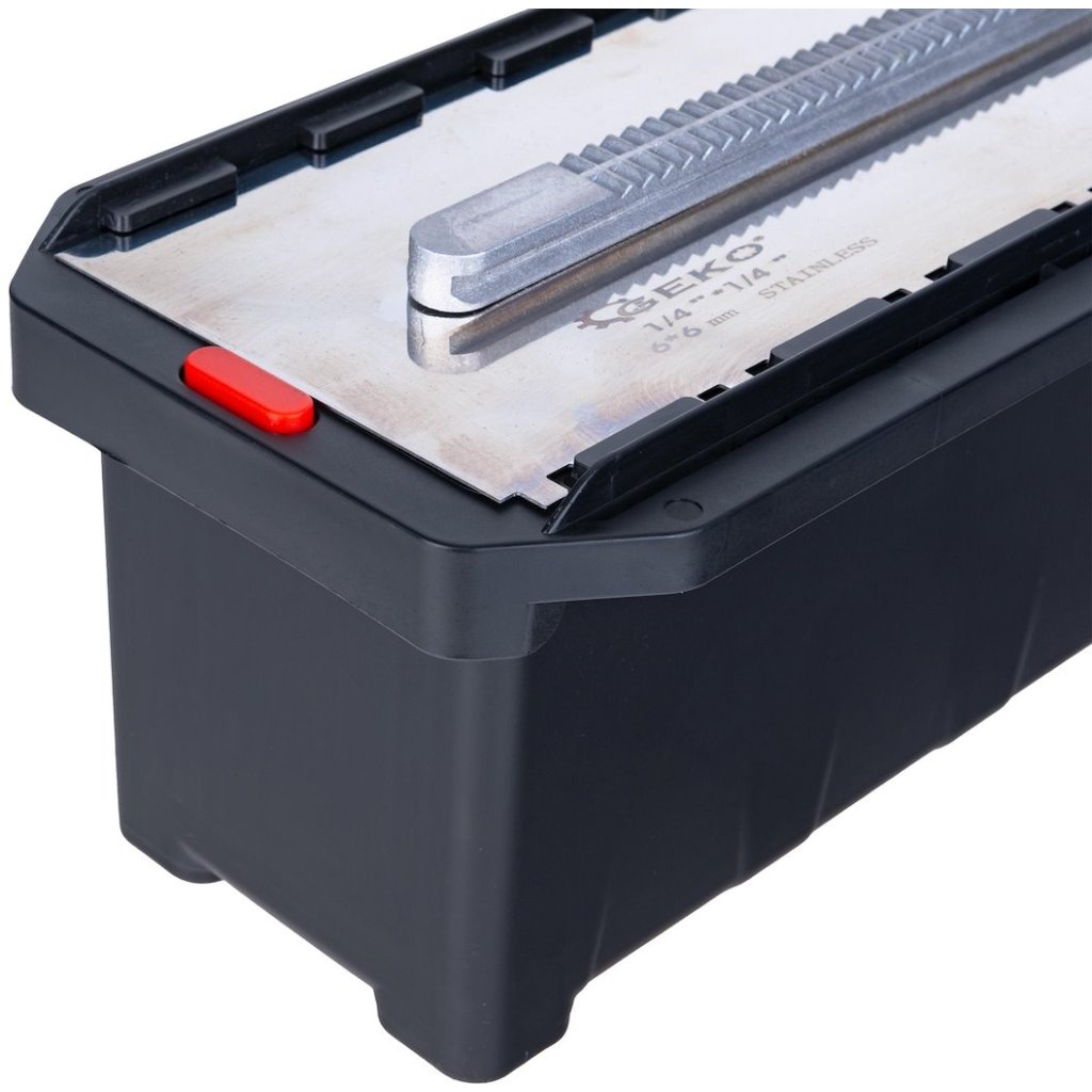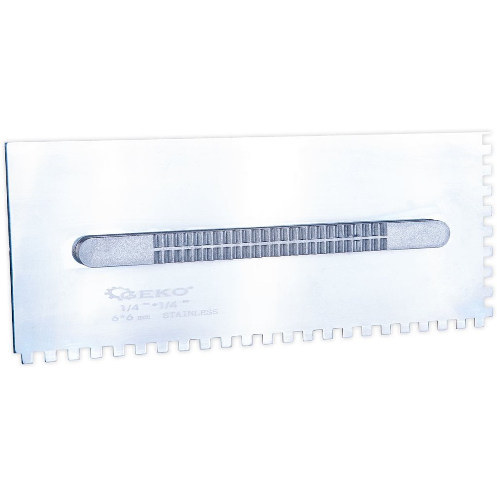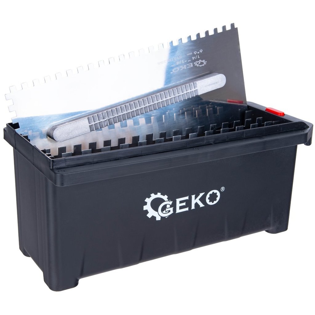 Kompletná sada na nanášanie lepidla na dlaždice – 6 vymeniteľných hrebeňov s rôznymi typmi zubov, rýchloupínacia rukoväť a praktický prepravný box – je riešením, ktoré zjednodušuje každodennú prácu obkladača.