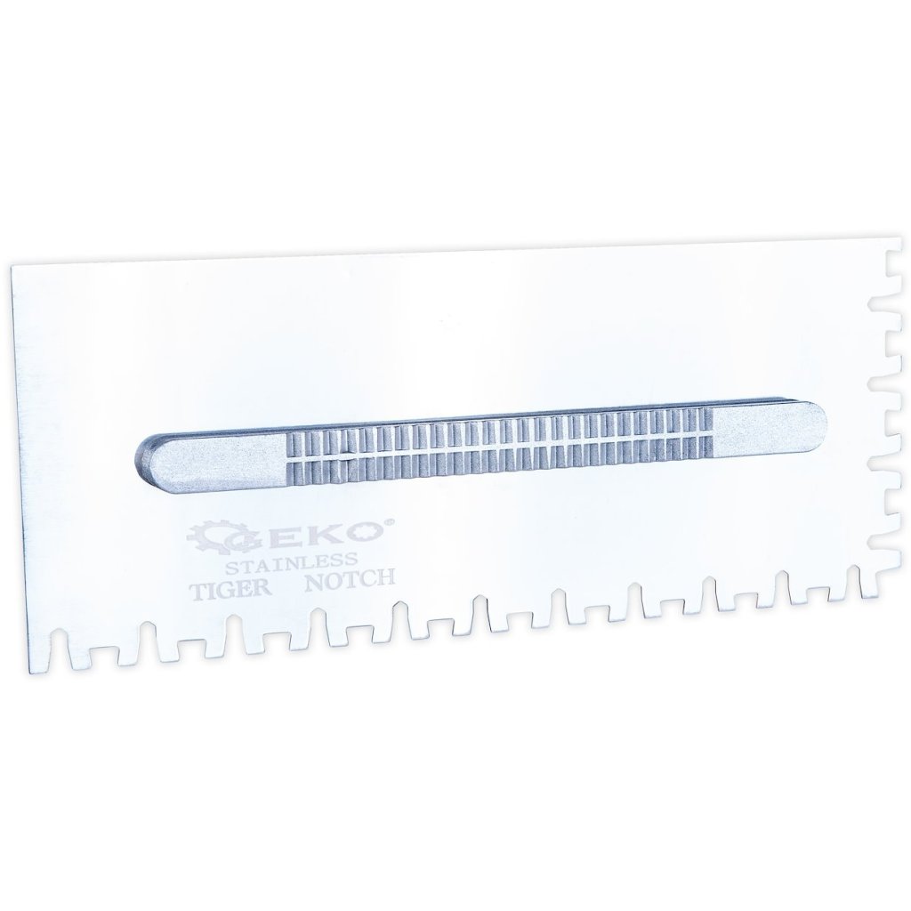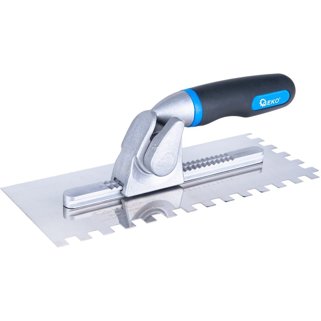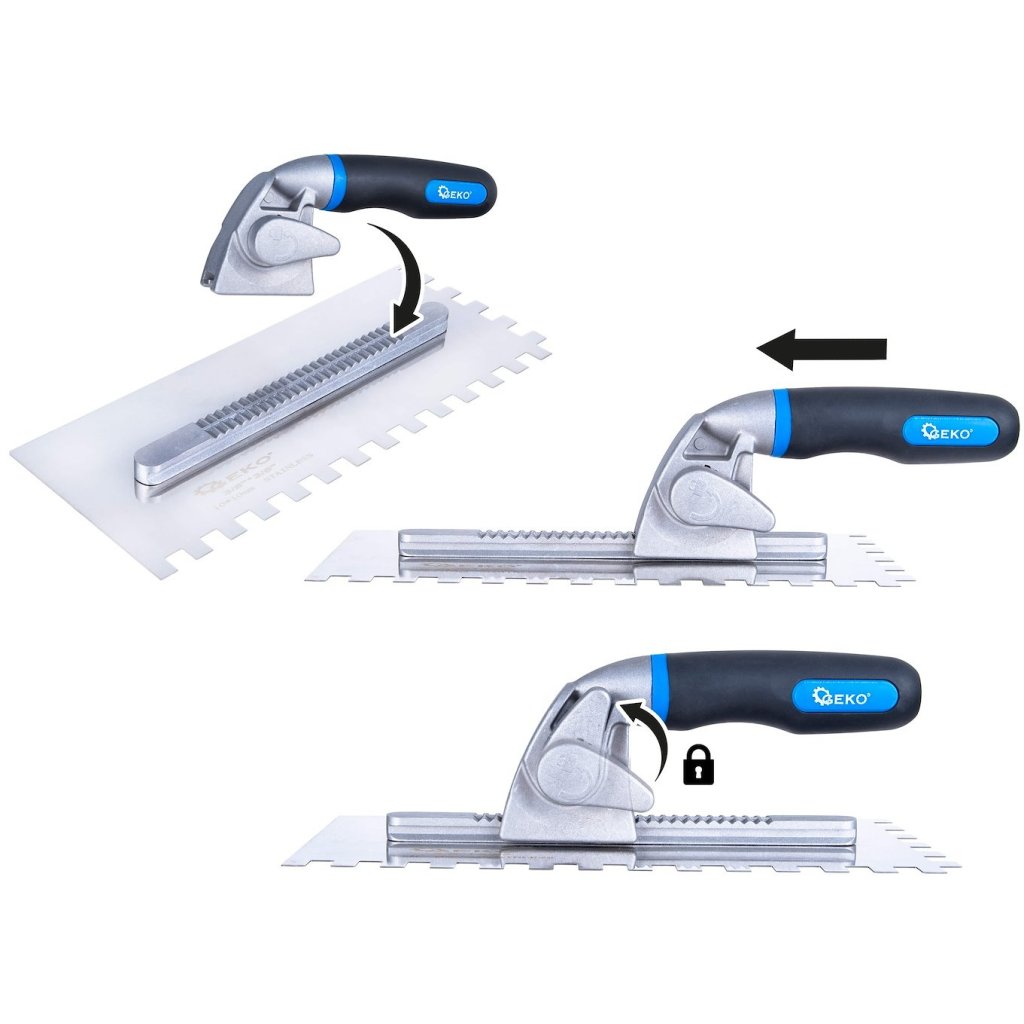 - Vymeniteľné hrebene s rýchlym upevnením – rýchla výmena hrotu bez použitia náradia – úspora času pri zmene typu zubov v závislosti od povrchu a typu lepidla.