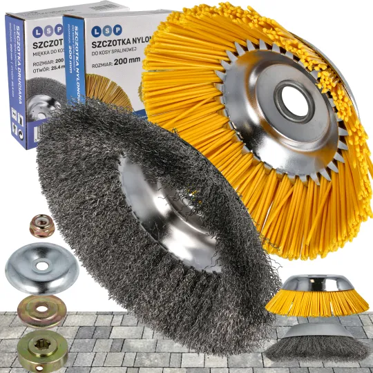 Sada 2 kief pre benzínovú kosu - mäkká drôtená a nylonová kefa. Ideálne na detailné čistenie dlažobných kociek, škár a chodníkov, a to aj pomocou čistiacich prostriedkov.