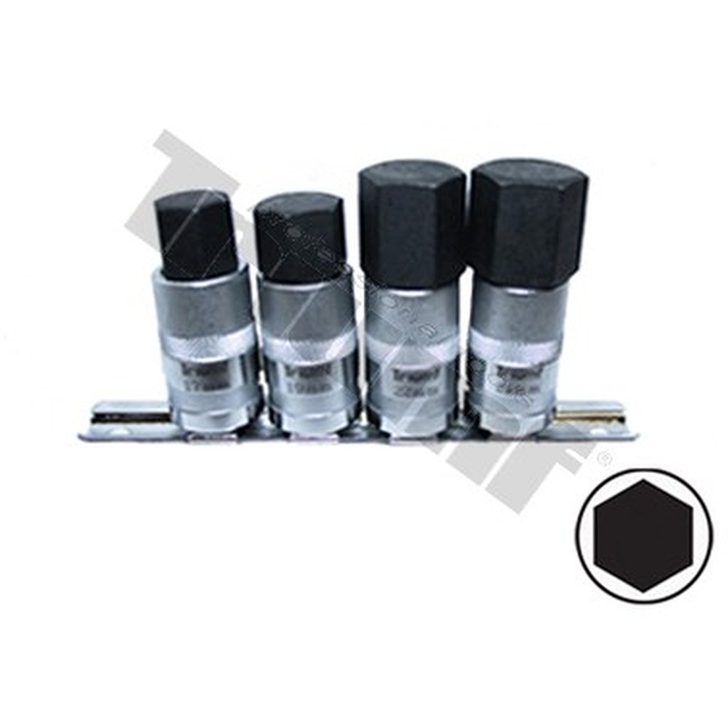 Materiál: S2, hlavice chróm - vanádiová oceľ.Sada extra veľkostí kľúčov Inbus 17 - 19 - 22 - 24 mm. Určená na doťahovanie poloosi, zavesení ramien motocyklov, obrábacích strojov v priemysle. Len na ručné požitie.