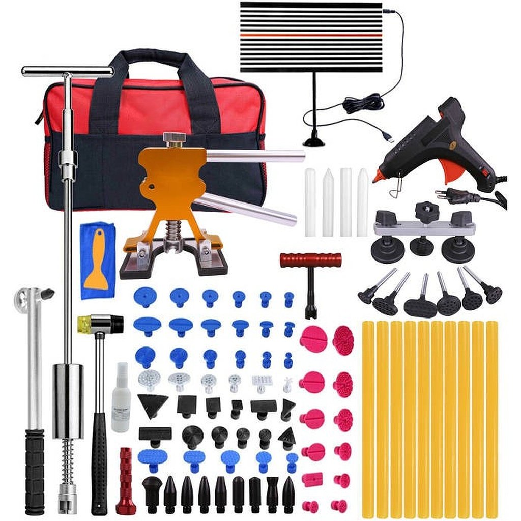 - Všetky potrebné prvky na opravu poškodenej karosérie: doska, lepiaca pištoľ, vyťahovač preliačin a nástavce na ich odstránenie. S touto súpravou opravíš poškodenia takmer na každom mieste svojho auta.
