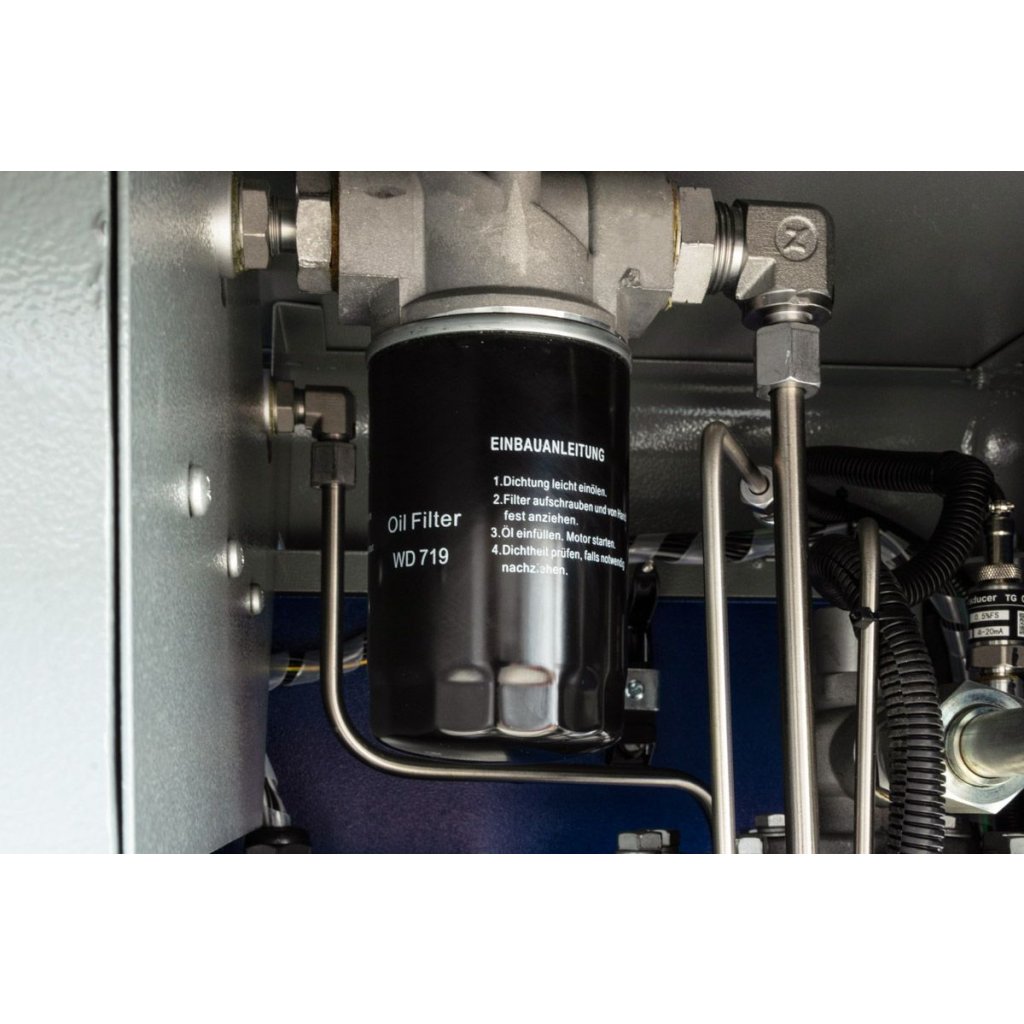 Moderný ovládací panel poskytuje plnú kontrolu nad prevádzkou kompresora. Umožňuje vám jednoducho sledovať a upravovať parametre, ako je prevádzkový tlak a teplota oleja, čo sa premieta do lepšej účinnosti a úspory energie.