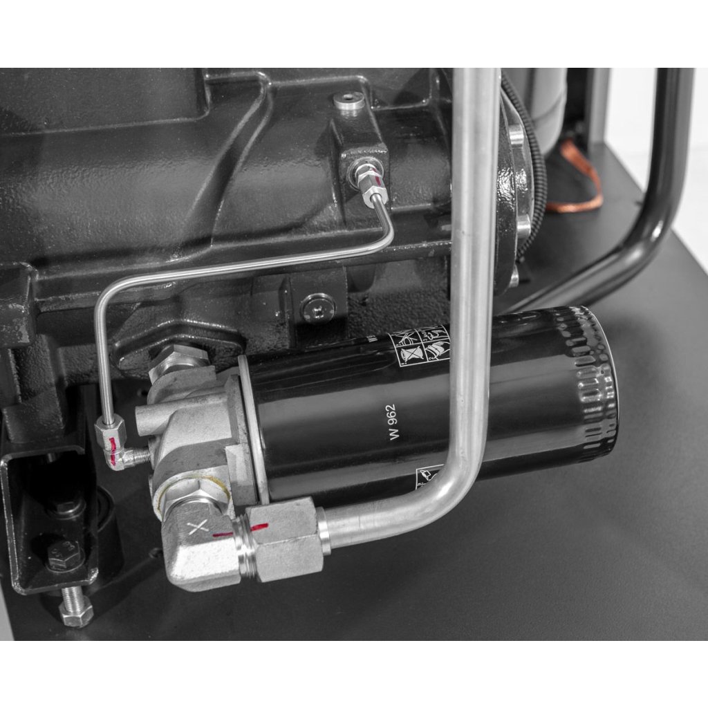 - Priamy pohon 1:1 - Priamy prenos výkonu z motora do kompresného modulu eliminuje energetické straty, čím zabezpečuje vyššiu prevádzkovú účinnosť a nižšie prevádzkové náklady.