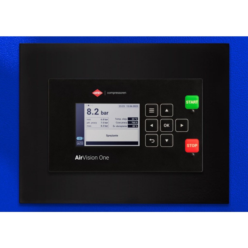Kompresor APS 7.5 IVR Combi X G2 wyposażony jest w nowoczesny panel sterowania AirVision, który umożliwia pełną kontrolę nad parametrami pracy urządzenia. Dotykowy, intuicyjny wyświetlacz pozwala na łatwe monitorowanie i regulowanie ciśnienia roboczego, przepływu powietrza oraz innych istotnych parametrów. Dzięki wbudowanemu modułowi Wi-Fi możliwy jest zdalny dostęp do kompresora, co pozwala na optymalizację jego pracy oraz szybką reakcję na ewentualne problemy. Funkcje takie jak automatyczny restart oraz inteligentne sterowanie wentylatorem chłodniczym dodatkowo zmniejszają zużycie energii i wydłużają żywotność urządzenia.