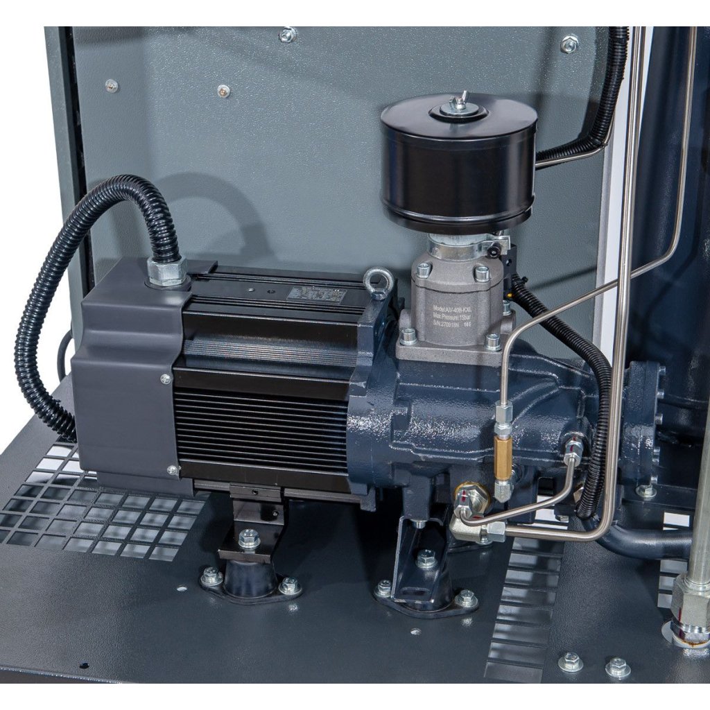 - Zmiennoobrotowa technologia IVR – Kompresor automatycznie dostosowuje prędkość pracy do aktualnych potrzeb, co pozwala na oszczędność energii nawet do 40% w porównaniu do tradycyjnych kompresorów stałoobrotowych.