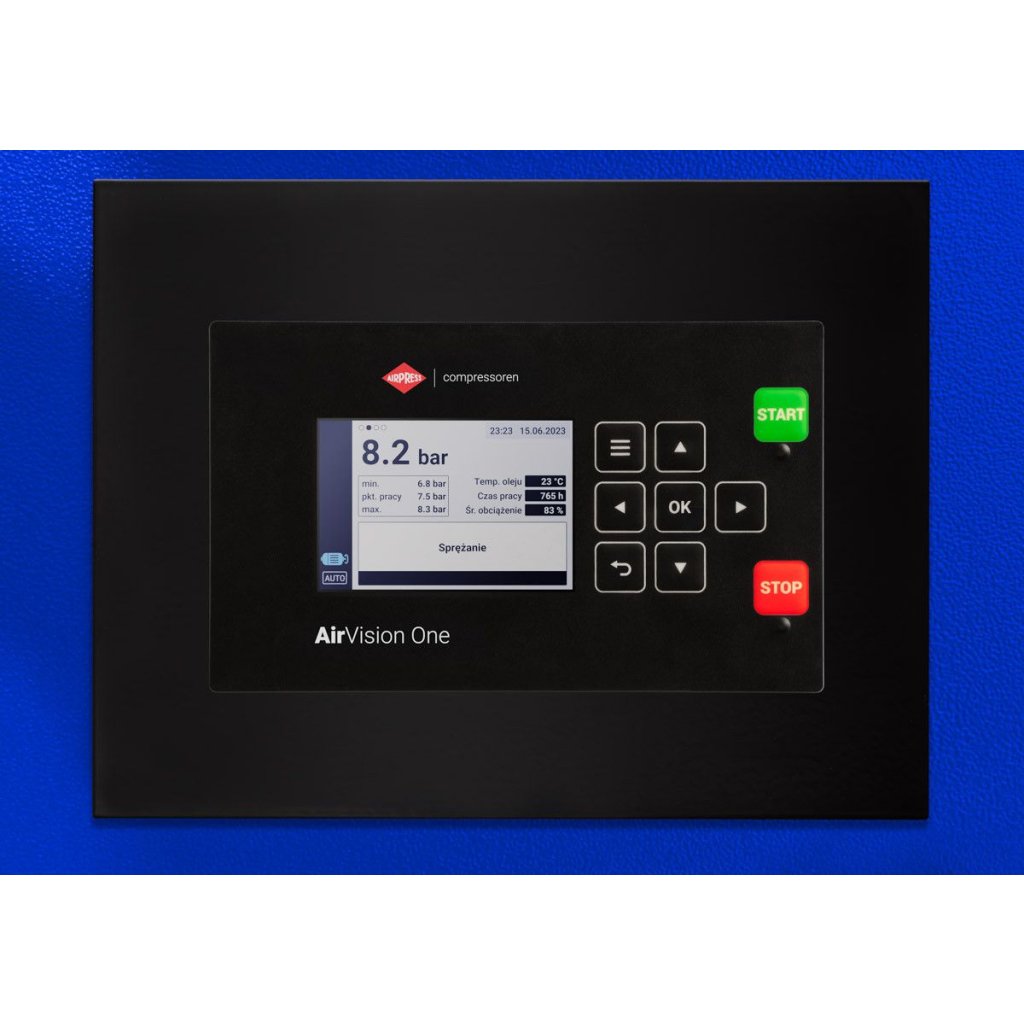 Kompresor APS 7.5 IVR X G2 je vybavený farebným dotykovým ovládacím panelom AirVision, ktorý umožňuje úplné ovládanie prevádzkových parametrov jednotky. Systém umožňuje diaľkové monitorovanie a správu kompresora vďaka zabudovanému modulu Wi-Fi, čo vám dáva možnosť ovládať prevádzku kompresora odkiaľkoľvek. Okrem toho funkcie ako automatický reštart, týždenné programovanie a inteligentné riadenie chladiaceho ventilátora umožňujú optimalizovať spotrebu energie a minimalizovať prevádzkové náklady.