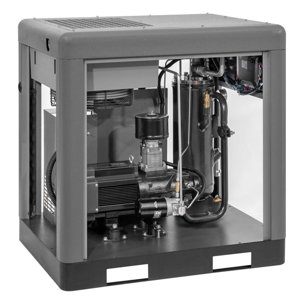 - Priamy pohon 1:1 - Priamy prenos energie z motora do kompresorového modulu eliminuje energetické straty, čím sa zvyšuje účinnosť kompresora a minimalizuje sa plytvanie energiou.