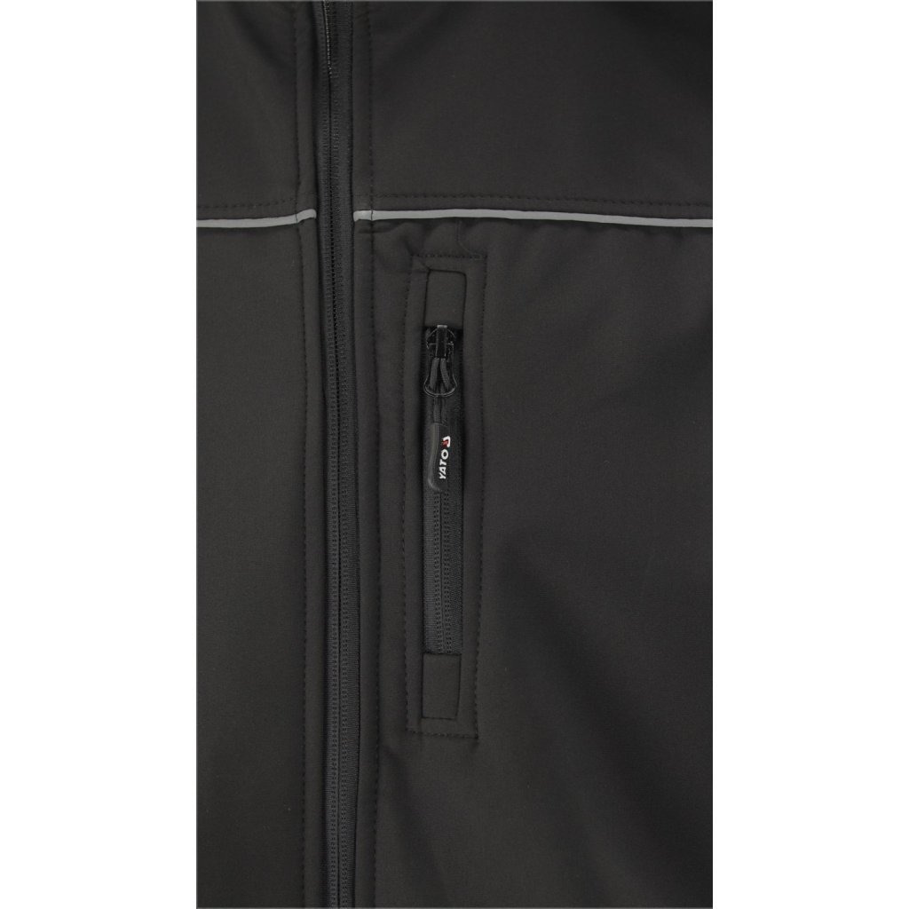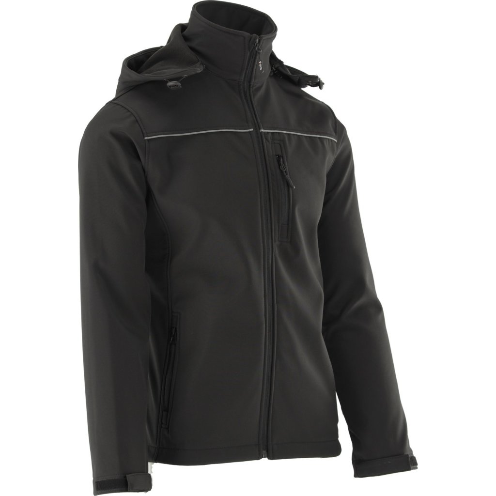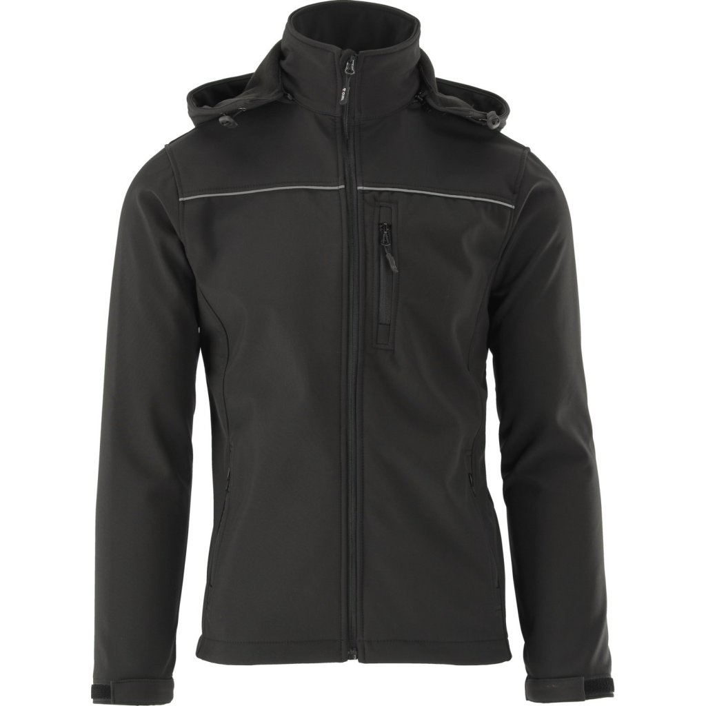 Softshellová bunda s tromi nepremokavými vreckami na zips a odnímateľnou kapucňou.