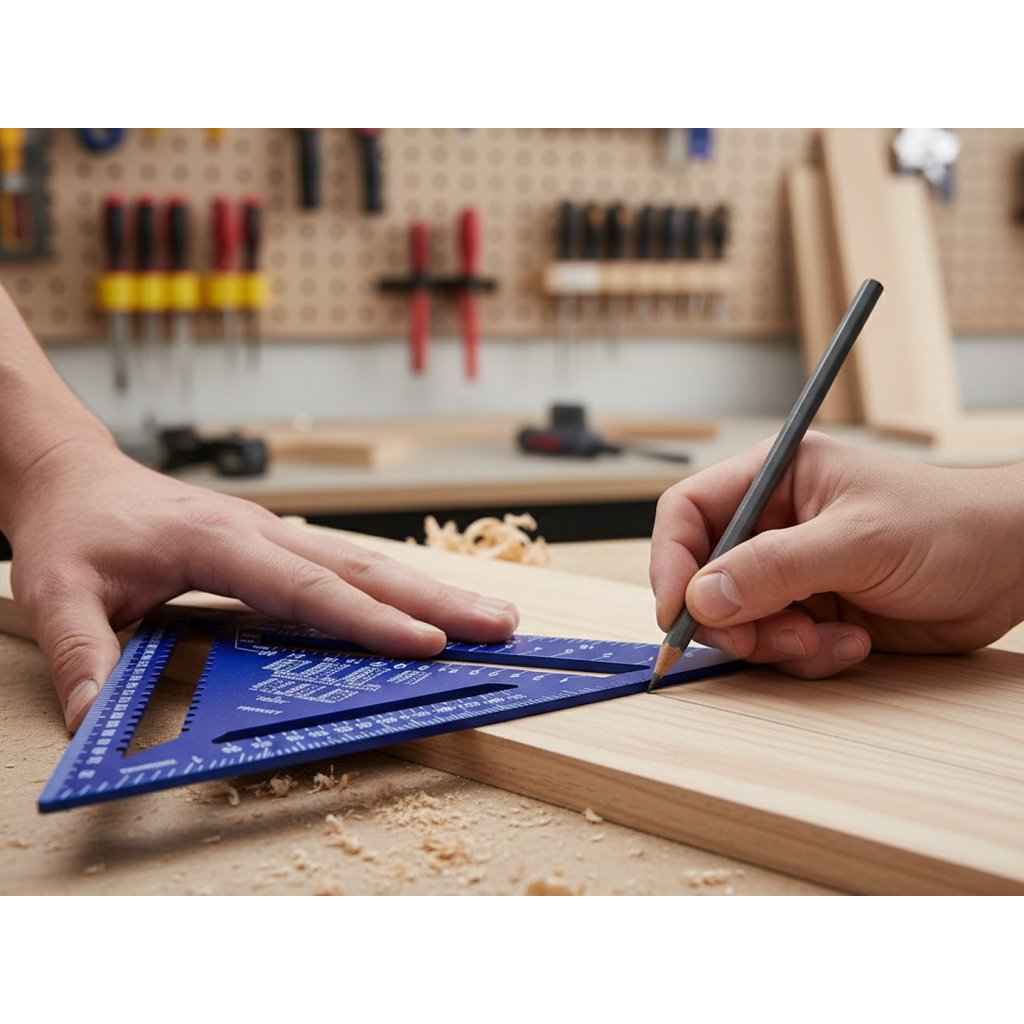 Tesársky uholník vyrobený z vysoko kvalitného hliníka , ktorý zaisťuje presné merania a pohodlie pri tesárskych, stavebných a dokončovacích prácach.