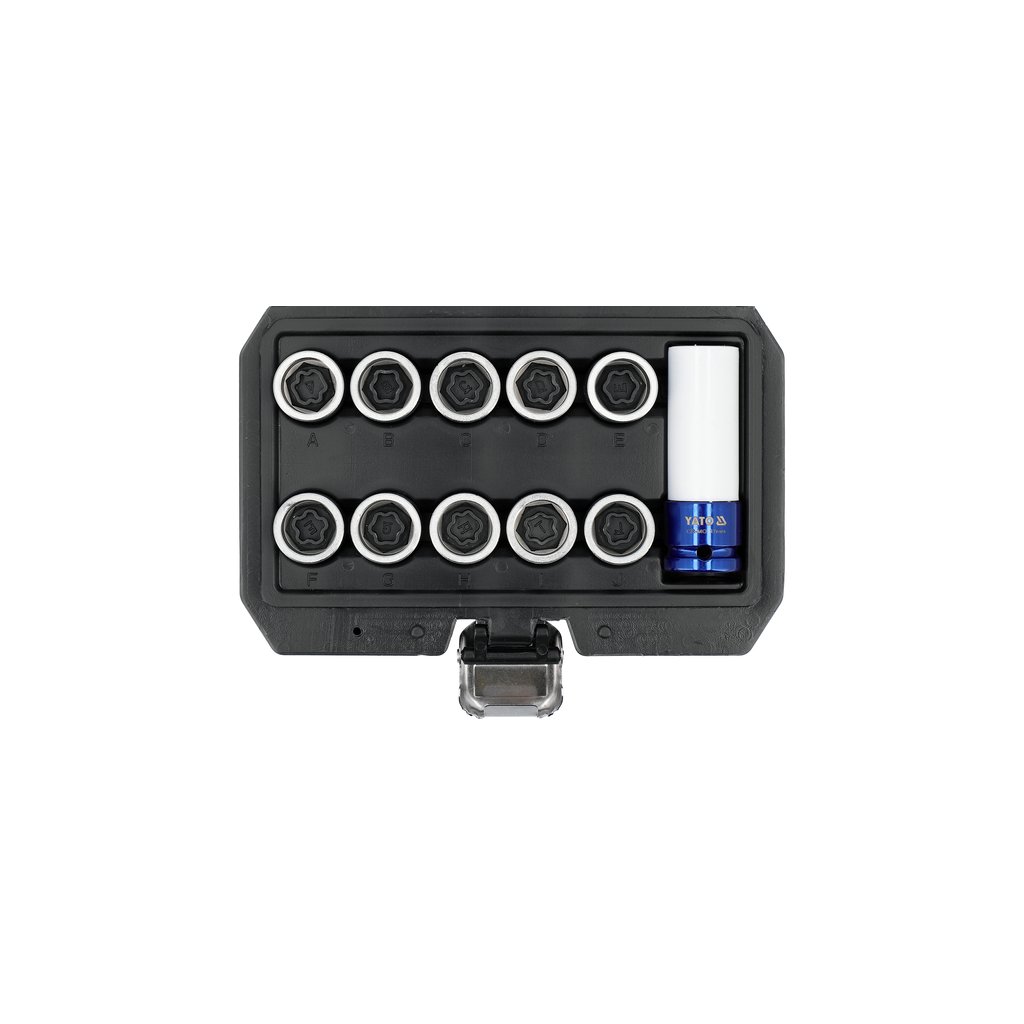 Sada nástrčných hlavíc na bezpečnostné skrutky pre vozidlá značky Toyota. Určená na použitie v autoservisoch a pneuservisoch.