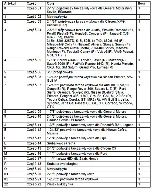 - Sada obsahuje dva lisy (pravotočivý a ľavotočivý), dva rôzne tvarované nosníky pre podopretie lisu na sedle upínadla a široký sortiment adaptérov. Presné lícovanie adaptéra a piestu zaručuje správne vloženie piestu do valca brzdového strmeňa. To zase chráni mechanika pred zaseknutím a zadretím piestu vo valci. Gombík je vybavený magnetickým hrotom, vďaka ktorému drží v osi platňu zodpovedajúcu danému piestu. Sada odporúčaná pre všeobecné mechanické autoservisy. Ideálne pre prácu s keramickými piestami.