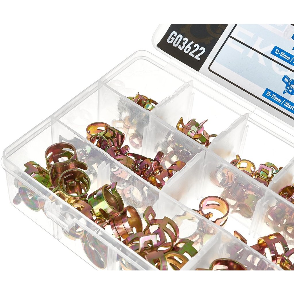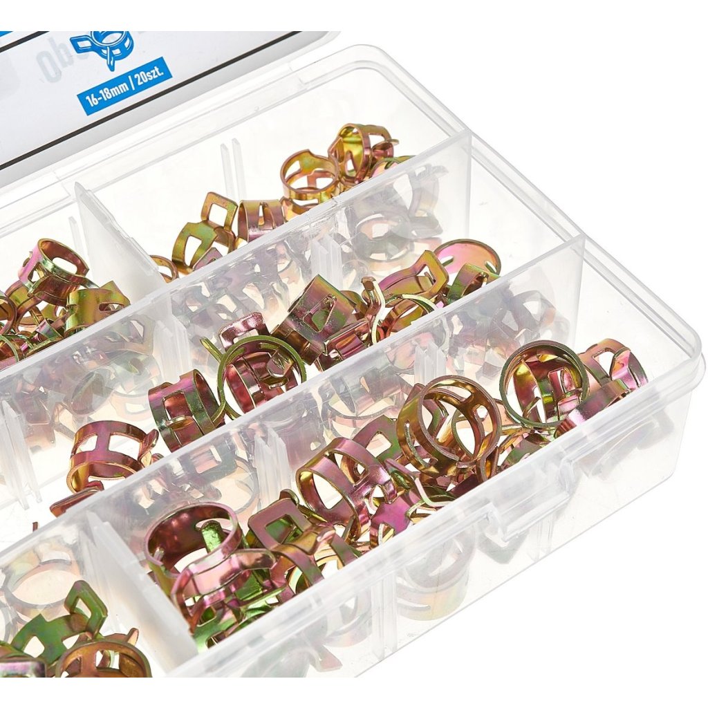 Univerzálna sada pružinových oceľových svoriek na rýchle a bezpečné upevnenie káblov, hadíc a potrubí. Tieto svorky poskytujú konštantný a rovnomerný tlak aj pri zmenách teploty a vibráciách, vďaka čomu sú ideálne pre automobilový priemysel, dielňu a priemysel. Celá sada je zabalená v praktickom organizéri s priehradkami – vďaka čomu sú rozmery usporiadané a pohodlné.