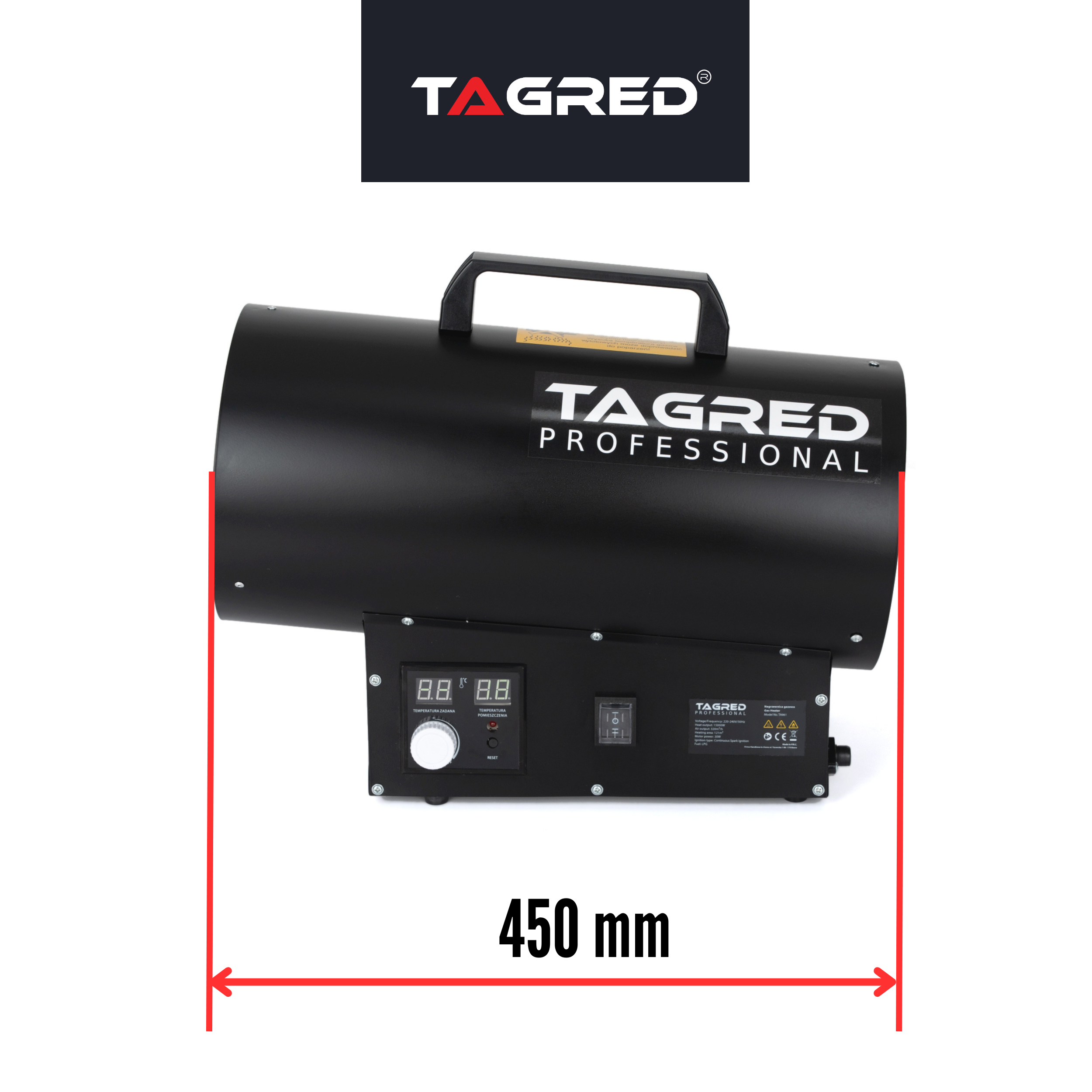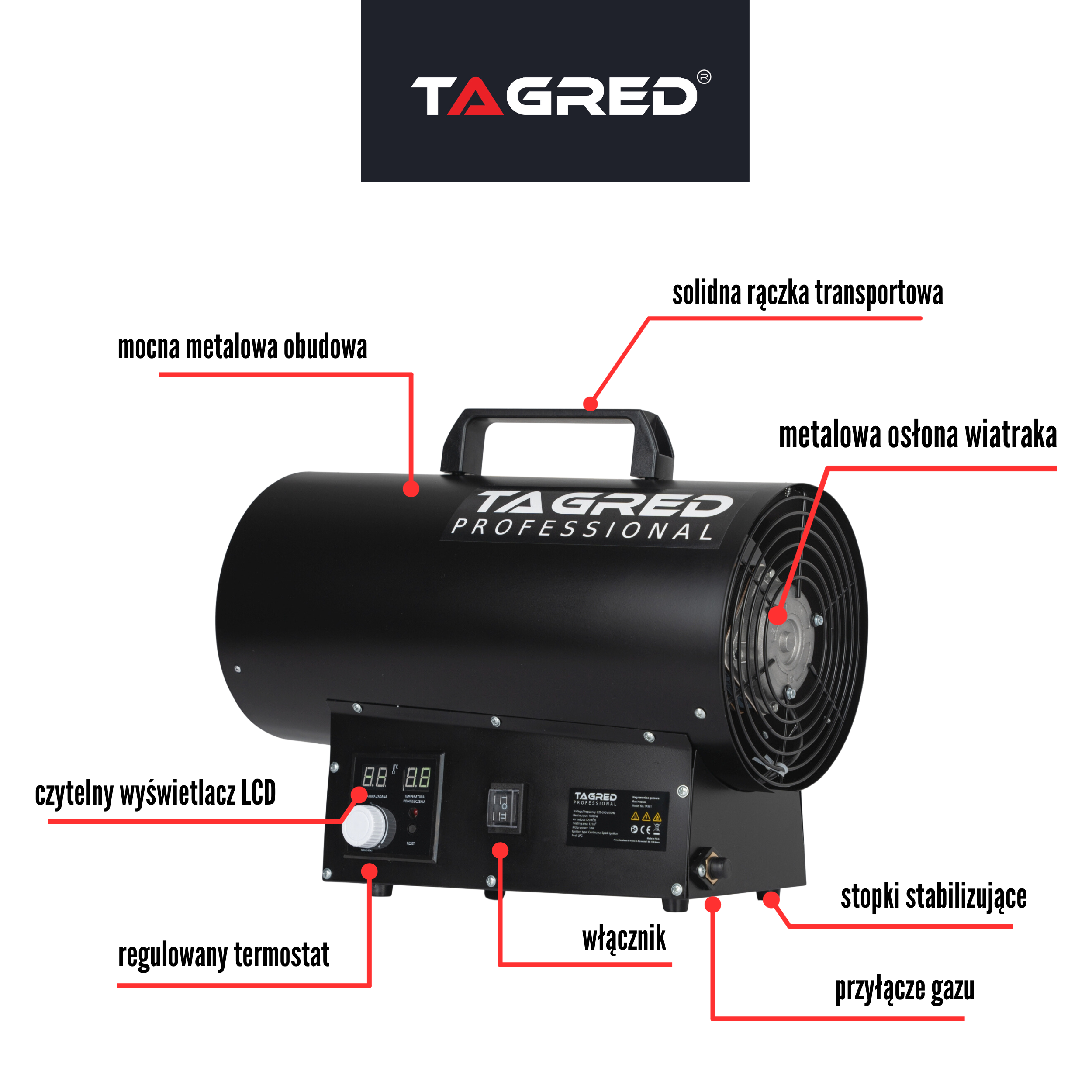 Plynový ohrievač TAGRED je prenosné zariadenie určené na vykurovanie skladov, výrobných hál a technických priestorov. Ohrievač je poháňaný propán-butánovým plynom. Zariadenie má množstvo bezpečnostných prvkov vrátane ochrany proti prehriatiu a úniku plynu .