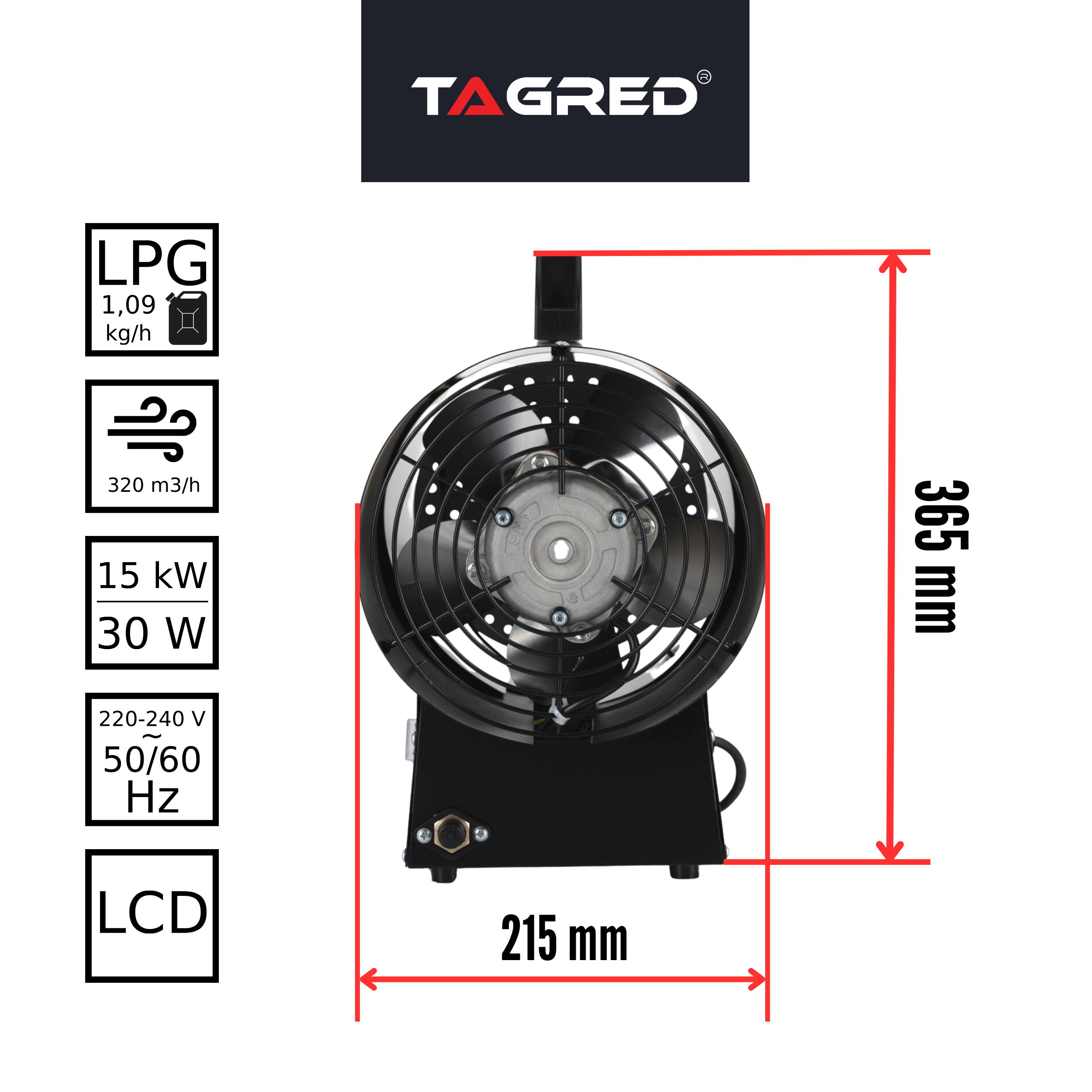 TAGRED 15kW plynový ohrievač, plynový ventilátor, termostat, LCD displej, hadica, reduktor