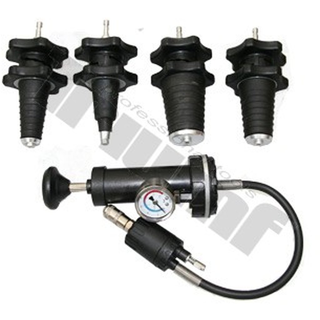 Sada obsahuje tlakovaciu manuálnu pumpu s manometrom a 4 ks kónických adaptérov rôznych priemerov 17 - 24 mm, 28 - 31,5 mm, 37 - 39,5 mm, 47 - 48,85 mm. Každý adaptér je zakončený rýchlospojkou na prepojenie s tlakovacou pumpou.Dodávané v PVC kufríku.