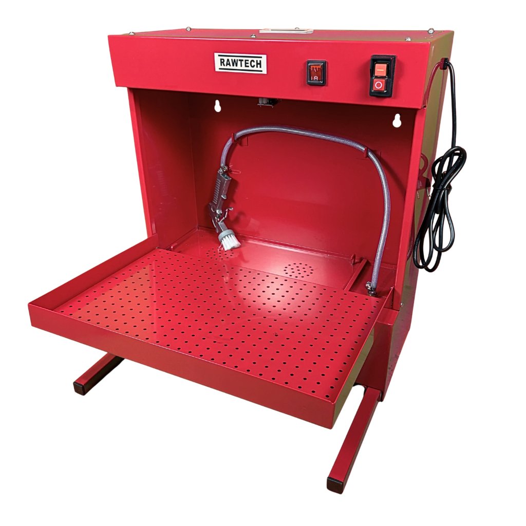 Stôl je vybavený praktickou poličkou so sitkom, ktorá umožňuje umývať viacero súčiastok naraz. Jeho kompaktné rozmery a jednoduché používanie zaručujú pohodlie pri práci.