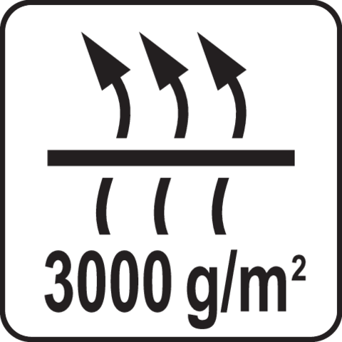 - priedušnosť 3000 MVP (približne 3000 g vody/potu sa vyparí spod 1 m² tkaniny smerom von za 24 h)