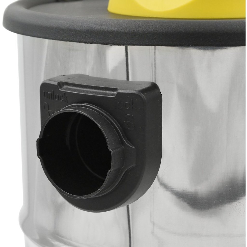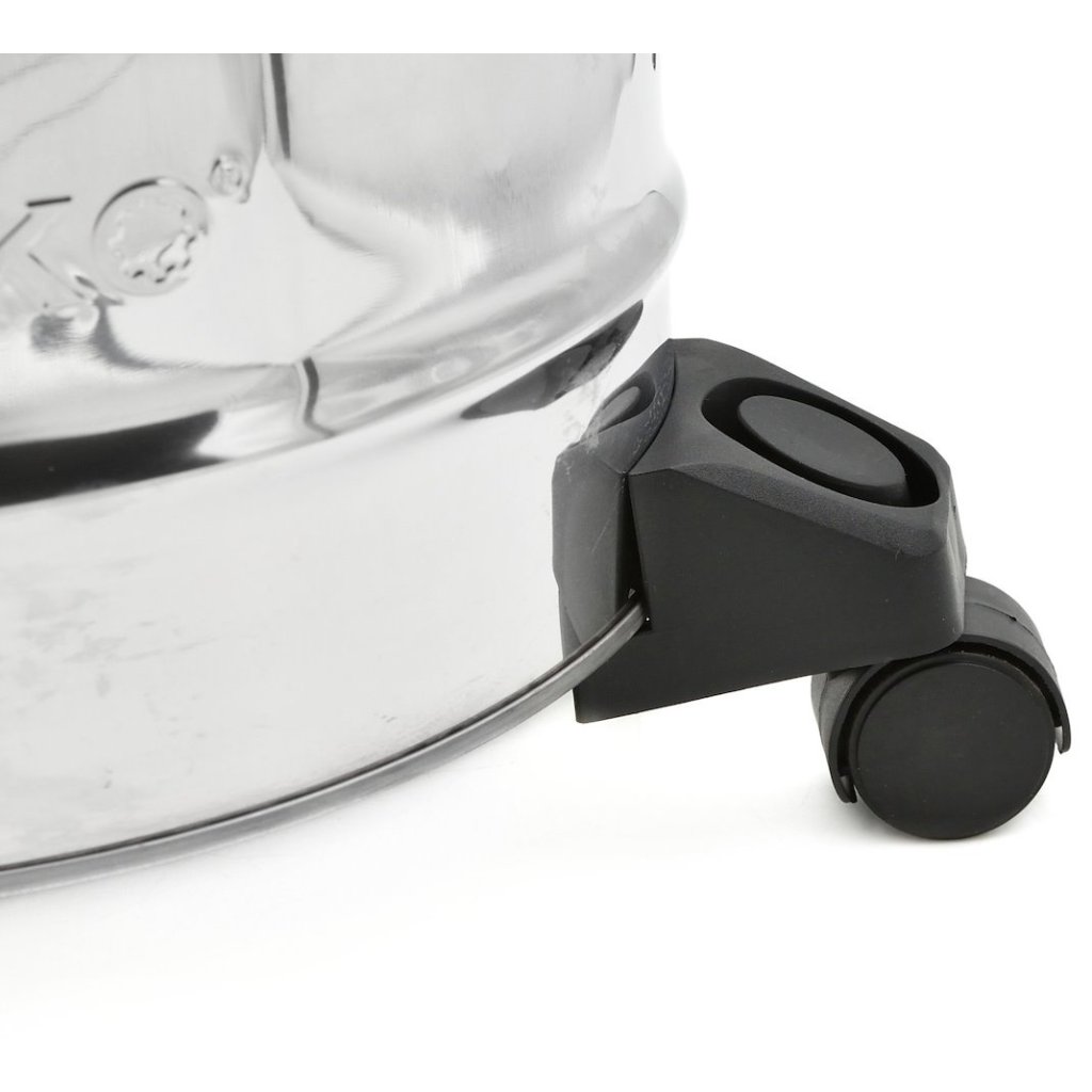 - Má kovovú 20l zbernú nádobu ktorá je vybavená kolieskami na ľahšie použitie, to je doplnené flexibilnou 2m hadicou.