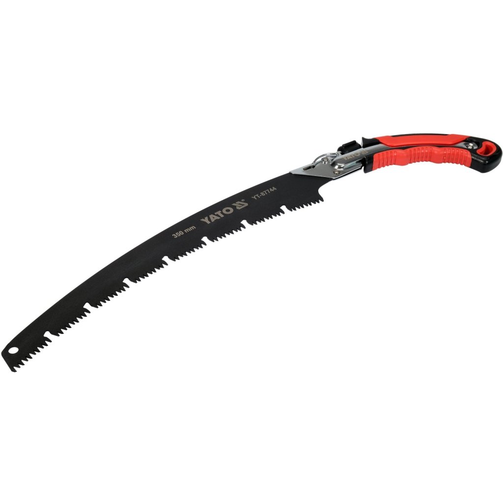 Píla so zakrivenou čepeľou z vysoko uhlíkovej ocele SK5. Indukčne kalené zuby píly, naostrené z troch strán. To umožňuje píle rezať v oboch smeroch. Čepeľ potiahnutá PTFE. Pogumovaná rukoväť z TPR na bezpečné uchopenie. Odnímateľná čepeľ. Píla je kompletná s puzdrom.