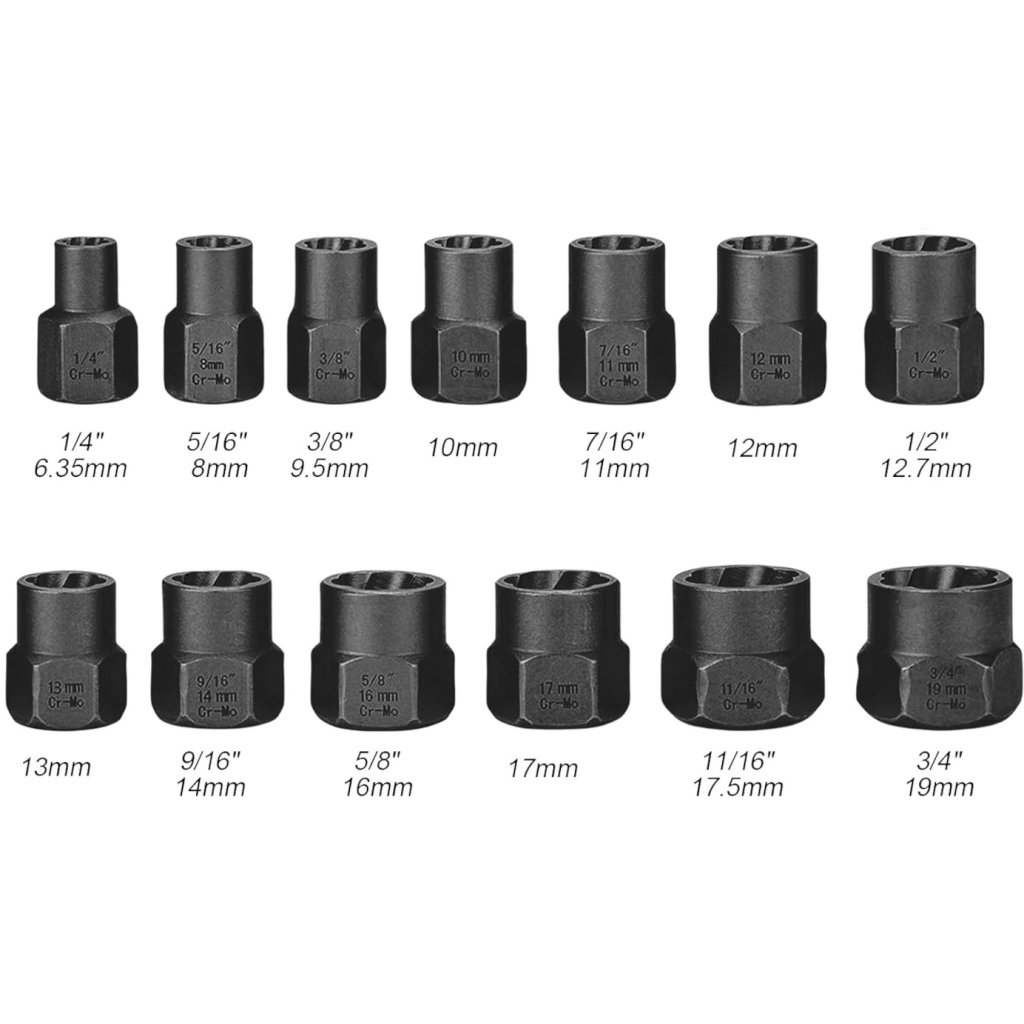- Nástrčky vhodné pre skrutky nasledujúcich veľkostí: 6,35 mm; 8 mm; 9,5 mm; 10 mm; 11 mm; 12 mm; 17,7 mm; 13 mm; 14 mm; 16 mm; 17 mm; 17,5 mm; 19 mm.